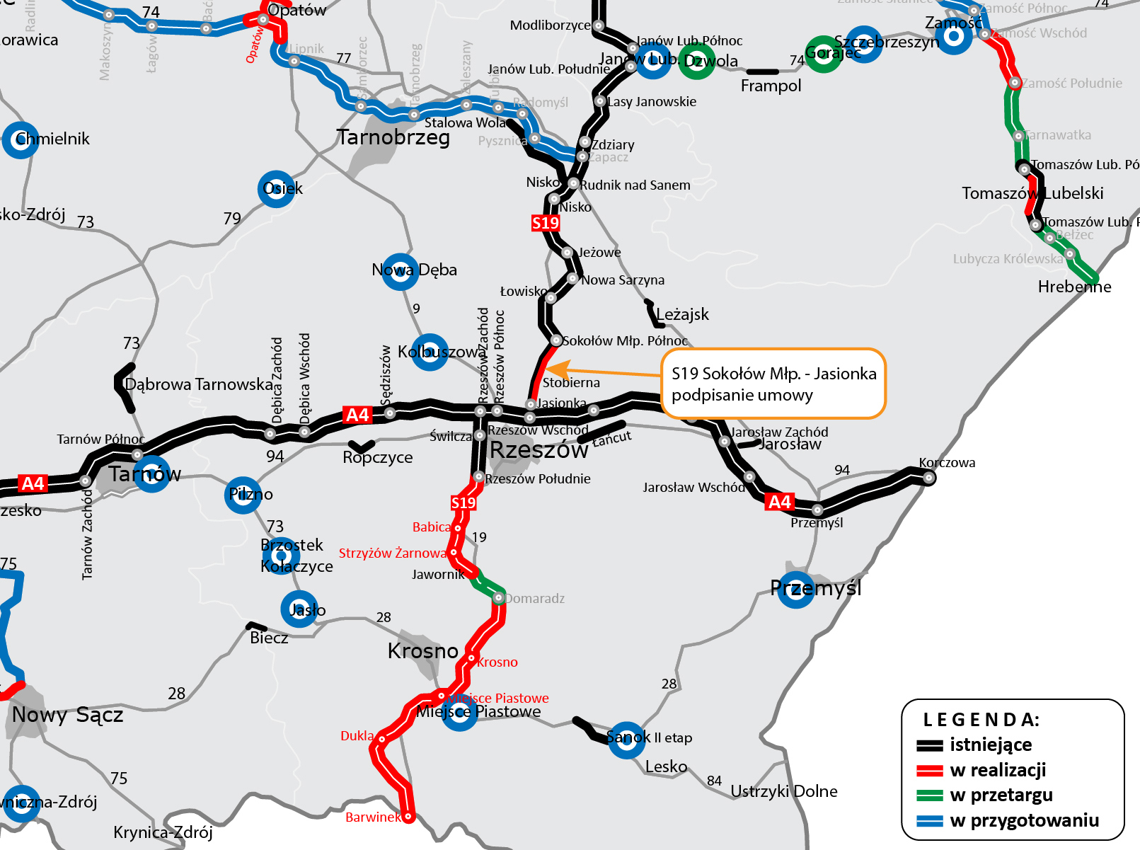 Zakres prac w ramach rozbudowy S19 obejmie także dostosowanie istniejących obiektów inżynierskich, urządzeń bezpieczeństwa ruchu drogowego (BRD) i ochrony środowiska. Przebudowane zostaną kolidujące drogi poprzeczne, cieki wodne oraz infrastruktura techniczna. Węzły Sokołów Małopolski Północ i Jasionka, które posiadają pełny, docelowy przekrój dwujezdniowy, nie będą wymagały rozbudowy. Łączna długość planowanych do rozbudowy odcinków drogi wynosi ok. 13,8 km.