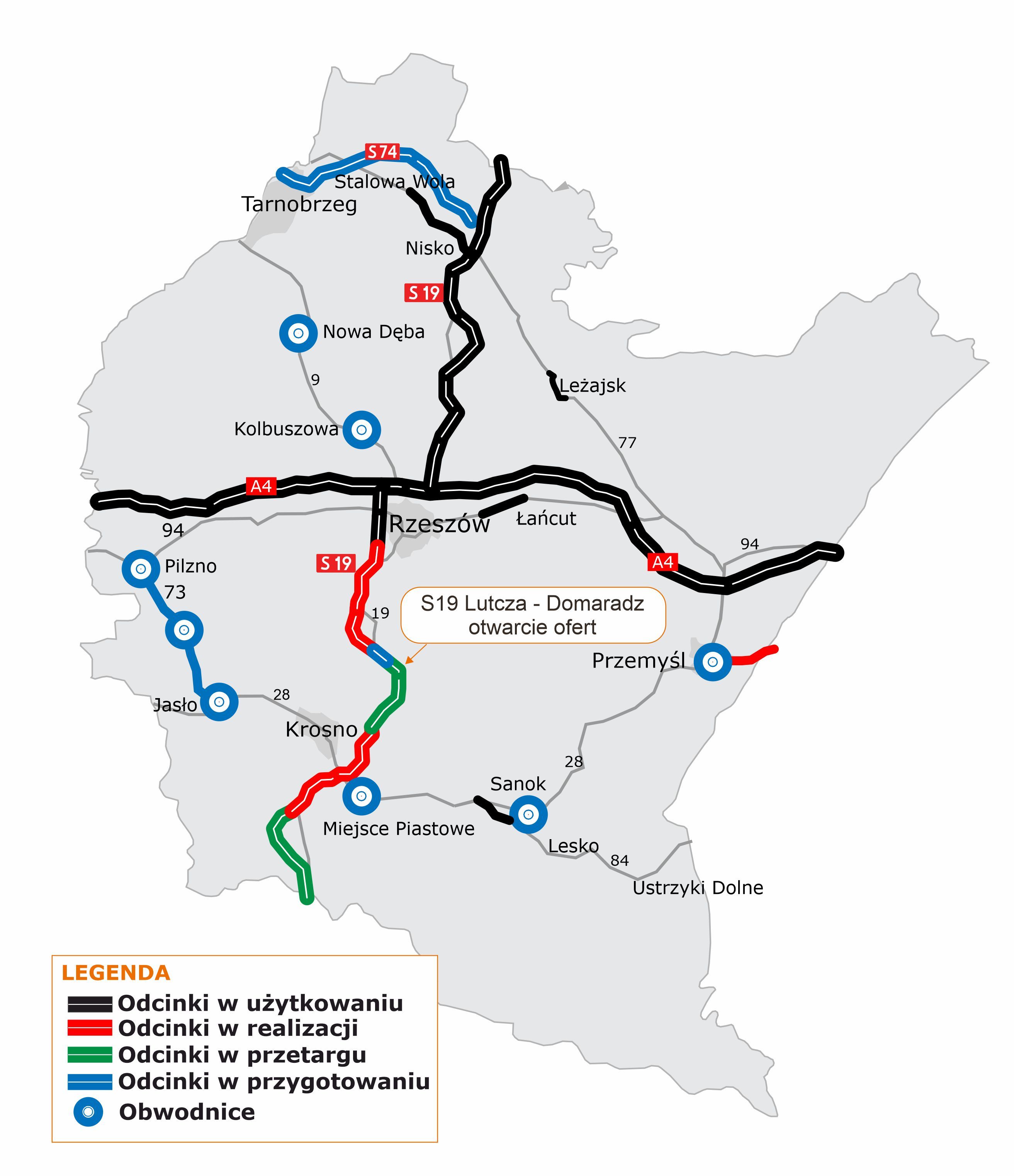 - 42,3 km - w przygotowaniu (na etapie przetargu: Lutcza - Domaradz, Domaradz - Iskrzynia, Dukla - Barwinek i dobudowa drugiej jezdni Sokołów Małopolski Płn. - Jasionka, przed ogłoszeniem przetargu: Jawornik - Lutcza).