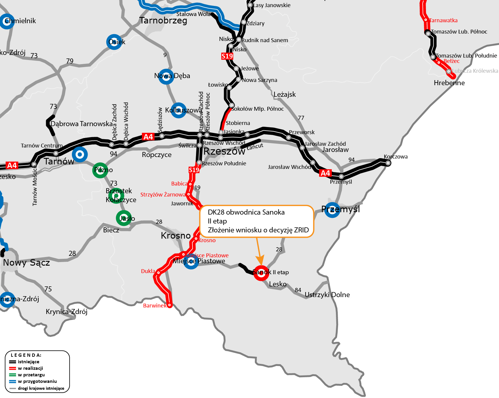 Oddany do ruchu 30 stycznia 2020 r. I etap obwodnicy Sanoka pozwolił na skierowanie ruchu tranzytowego z kierunku Krosna na DK28 i DK84 w kierunku przejścia granicznego Krościenko - Smolnica. Budowa II etapu spowoduje domknięcie obwodnicy miasta w ciągu DK28, która za Sanokiem biegnie w kierunku Przemyśla.
