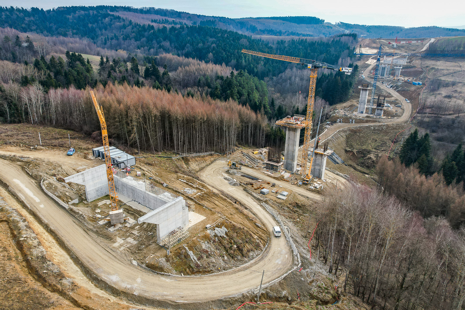 Podróż wijącymi się serpentynami prowadzi nas do kolejnego obiektu, tym razem estakady ES-17. Prace przy tej konstrukcji realizowane są w niezwykle skomplikowanym geologicznie terenie. Obiekt powstaje nad głębokim jarem. Jeszcze kilka miesięcy temu wykonawca prowadził intensywne prace przy budowie dróg technologicznych tak, aby móc transportować niezbędne materiały budowlane. Obecnie prace przy budowie tej konstrukcji koncentrują się na robotach palowych. Dwie podpory posiadają już wykonane pale fundamentowe. W zeszłym tygodniu kontynuowano roboty z zakresu zbrojenia, deskowania i betonowania oczepu fundamentowego podpór. Stan zaawansowania robót tej estakady to ok. 8%.