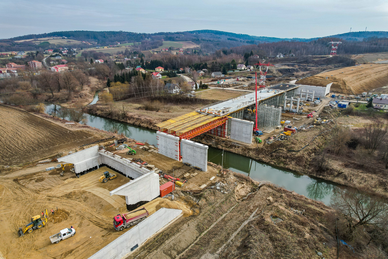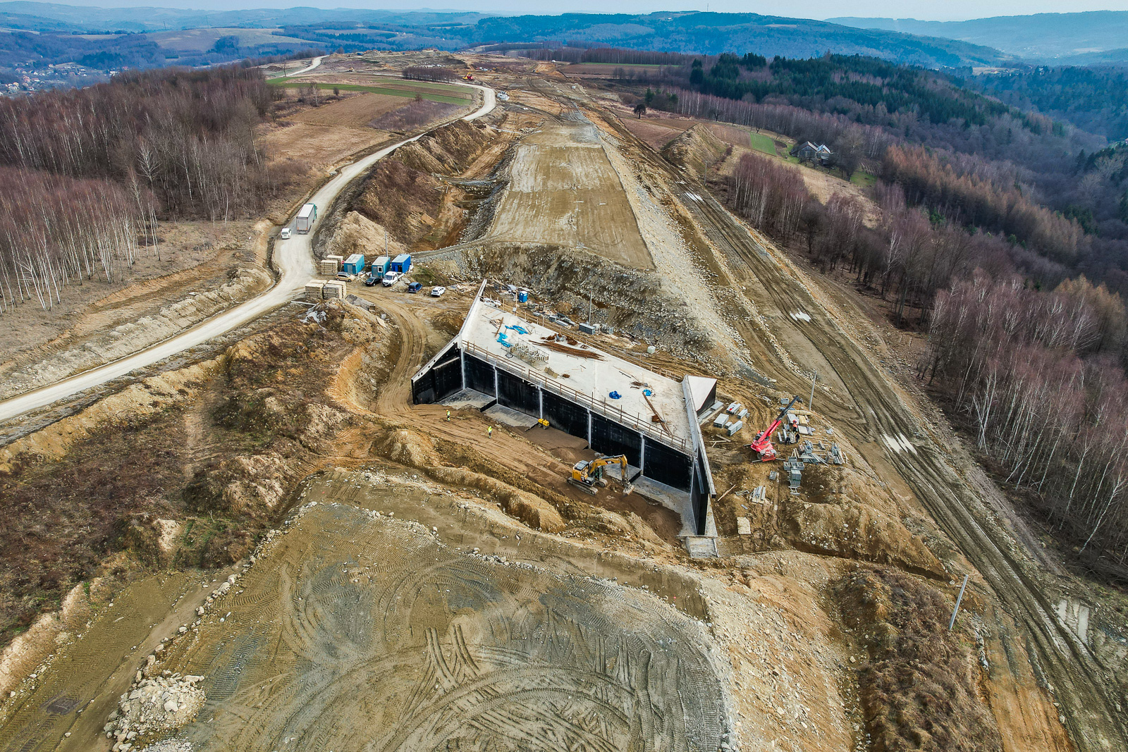 W najbardziej imponującym miejscu na budowie powstaje największy obiekt, a jednocześnie najwyższa konstrukcja drogowa w Polsce, estakada ES-26. Ośmioprzęsłowa konstrukcja o długości całkowitej 1082 m i szerokości 29 m łagodnie wpisuje się w otaczający teren. Jednak to nie długość czy szerokość są parametrami, które wyróżniają ten obiekt najbardziej. Takim parametrem jest wysokość całej konstrukcji w jednej z osi. W najwyższym punkcie przekracza 80 m, co oznacza, że jej wysokość przewyższa wieżę Bazyliki Mariackiej w Krakowie. Co więcej, warto wspomnieć o wysokości konstrukcyjnej ustroju nośnego, która maksymalnie wynosi 12,5 m. Łatwo sobie wyobrazić zatem, że mógłby się tam zmieścić dom jednorodzinny. Projektowanie tak spektakularnej konstrukcji w niełatwym terenie stanowiło wyzwanie pod względem posadowienia. Aby wygrać tę nierówną walkę z geologią, projektant w najbardziej niekorzystnych warunkach przewiduje konieczność wykonania pali o średnicy 1,5 m i długości 42,0 m.