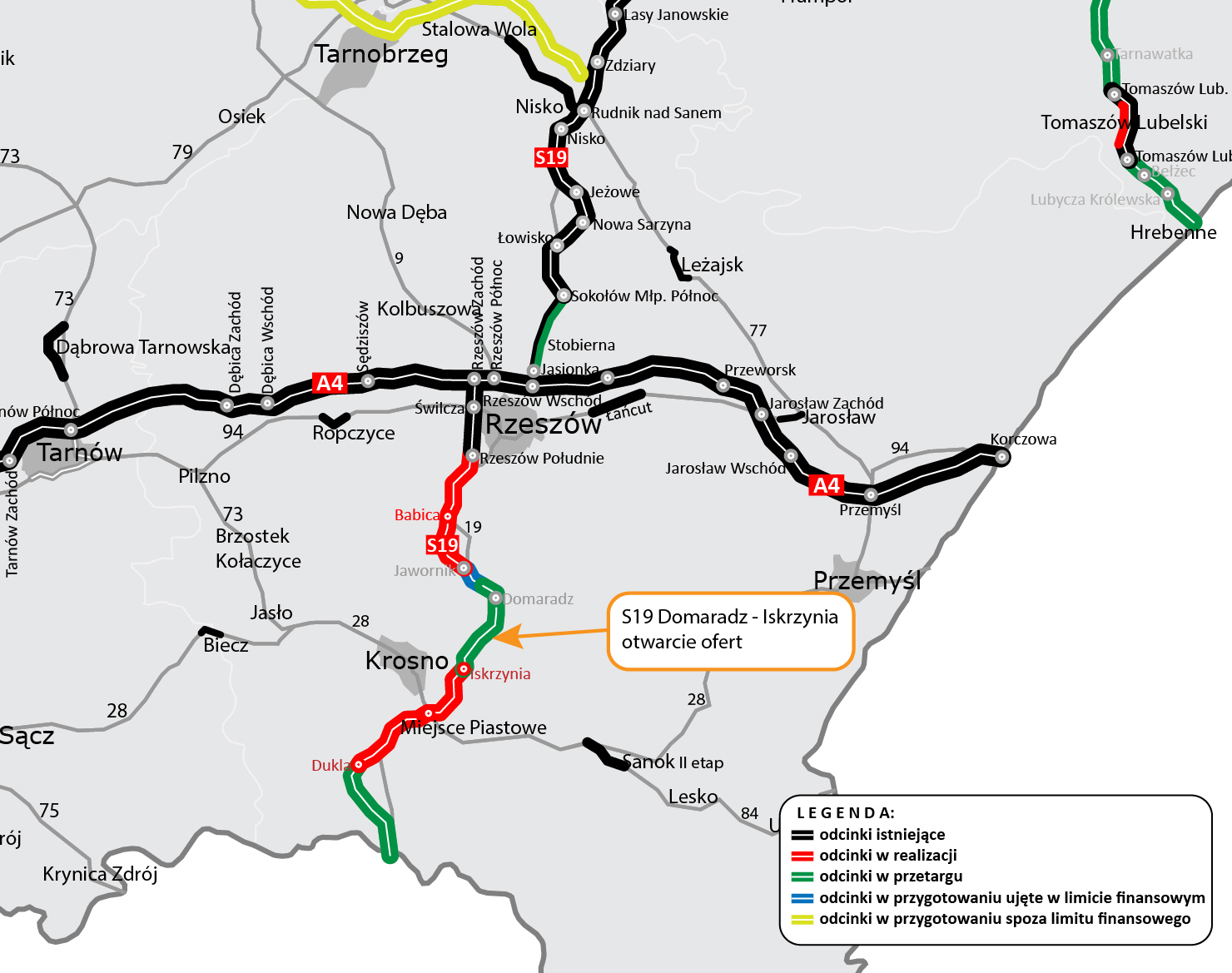 42,3 km - w przygotowaniu (na etapie przetargu: Lutcza - Domaradz, Domaradz - Iskrzynia, Dukla - Barwinek i dobudowa drugiej jezdni Sokołów Małopolski Płn. - Jasionka, przed ogłoszeniem przetargu: Jawornik - Lutcza).