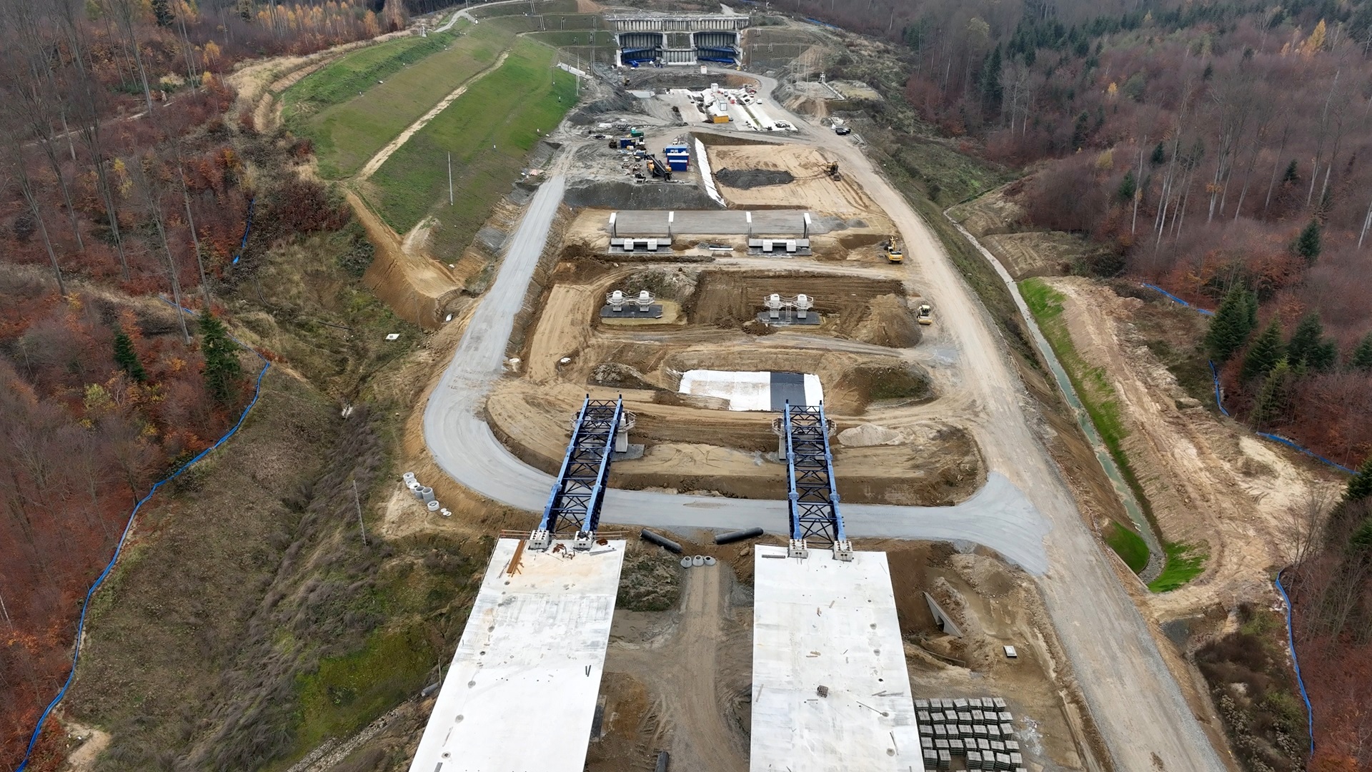 Przez ostatni rok z dużą intensywnością prowadzone były roboty w branży mostowej. Sporym sukcesem wykonawcy w ostatnich miesiącach było skomunikowanie wszystkich obiektów inżynierskich na zaplanowanej trasie. Tym samym uzyskano możliwość transportu niezbędnych materiałów potrzebnych do budowy obiektów. W tym miejscu należy przypomnieć, iż w ramach realizowanego zadania powstanie osiem estakad, pięć wiaduktów oraz cztery przejścia dla zwierząt. Część budowanych estakad posiada już wybetonowane korpusy filarów oraz przyczółków. Przykładem może być pierwszy obiekt inżynierski na zaplanowanej trasie (ES-13), na którym obecnie trwa budowa ustroju nośnego przęseł metodą rusztowań stacjonarnych.