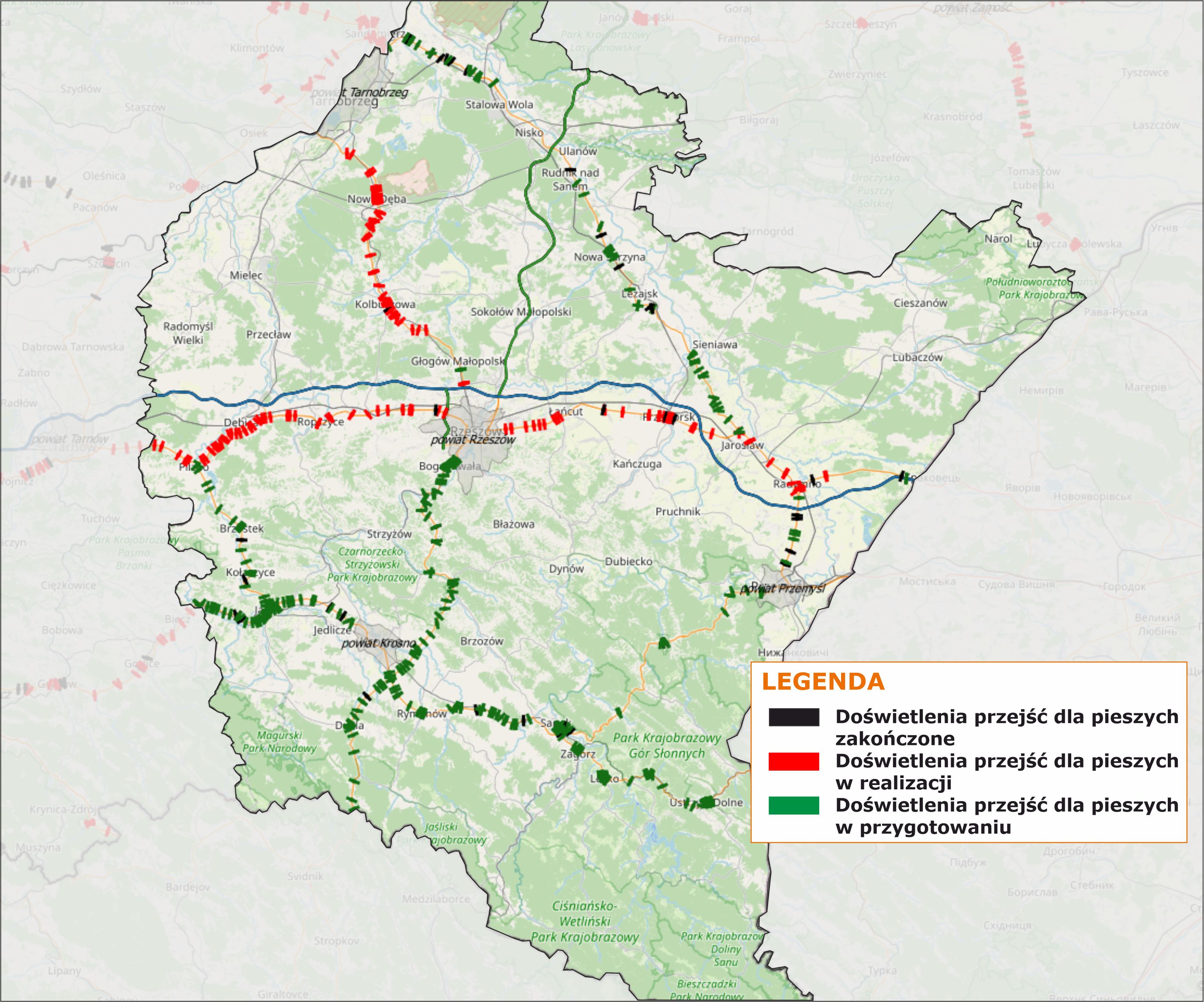W trakcie realizacji jest budowa oświetlenia na 192 przejściach dla pieszych zlokalizowanych na DK9, DK28, DK77 i DK94. Wartość tych prac to kwota ok. 17,5 mln zł. Kolejne doświetlenia przejść planujemy na DK28 w Sanoku i Sławęcinie oraz na DK77 w Żurawicy, a także na DK94 na skrzyżowaniu ul. Rzeszowskiej z drogą gminną w Sędziszowie Małopolskim, gdzie wybudowana zostanie sygnalizacja świetlna wraz z przejściem dla pieszych.