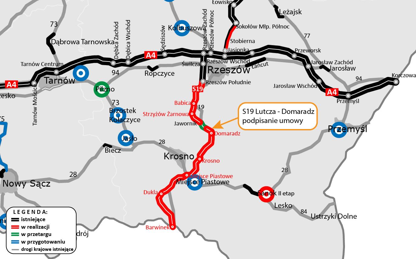Zadanie S19 Lutcza – Domaradz zostało podzielone na dwa odcinki realizacyjne, z których jeden jest z krótszym terminem realizacji. Aby umożliwić wcześniejsze oddanie do ruchu sąsiedniego odcinka Domaradz – Krosno, węzeł Domaradz wraz z prawie kilometrowym odcinkiem drogi ekspresowej zostanie wykonany w ciągu 35 miesięcy od daty podpisania umowy. Pozostała część odcinka, wraz z tunelem, zostanie ukończona w ciągu 53 miesięcy. Do czasu realizacji robót budowlanych nie wlicza się okresów zimowych tj. czasu od 1 grudnia do 31 marca.