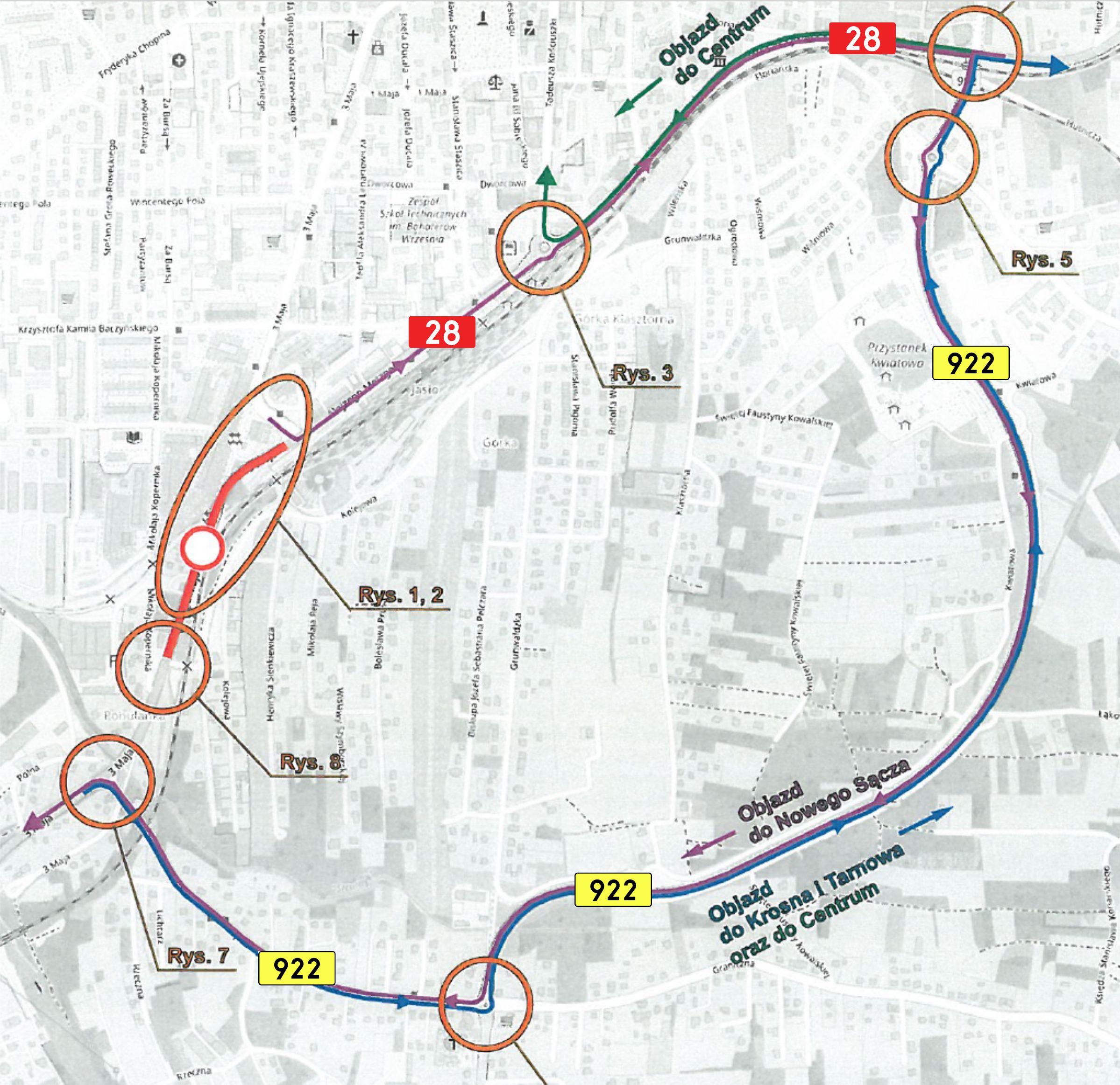 W związku z remontem wiaduktu nad linią kolejową w m. Jasło (ul. 3 Maja), od poniedziałku 8 sierpnia br., odcinek DK28 od skrzyżowania ulic 3 Maja i Metzegera do skrzyżowania z ulicą Kolejową zostanie zamknięty dla ruchu. Wyznaczony zostanie objazd.
