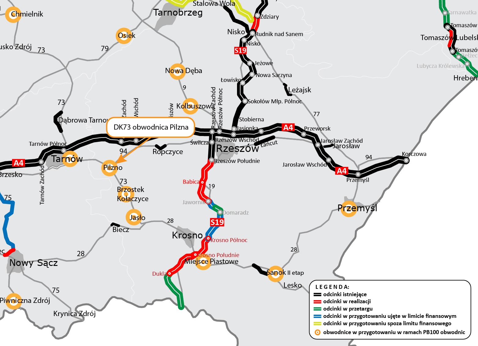 W ramach rządowego Programu budowy 100 obwodnic w woj. podkarpackim powstanie osiem nowych inwestycji drogowych, które obecnie są w przygotowaniu. Dla wszystkich zadań są już wyłonieni wykonawcy, którzy rozpoczęli opracowywanie dokumentacji (STEŚ-R - Studium korytarzowe, Studium-techniczno-ekonomiczno-środowiskowe z elementami koncepcji programowej oraz uzyskanie decyzji o środowiskowych uwarunkowaniach):