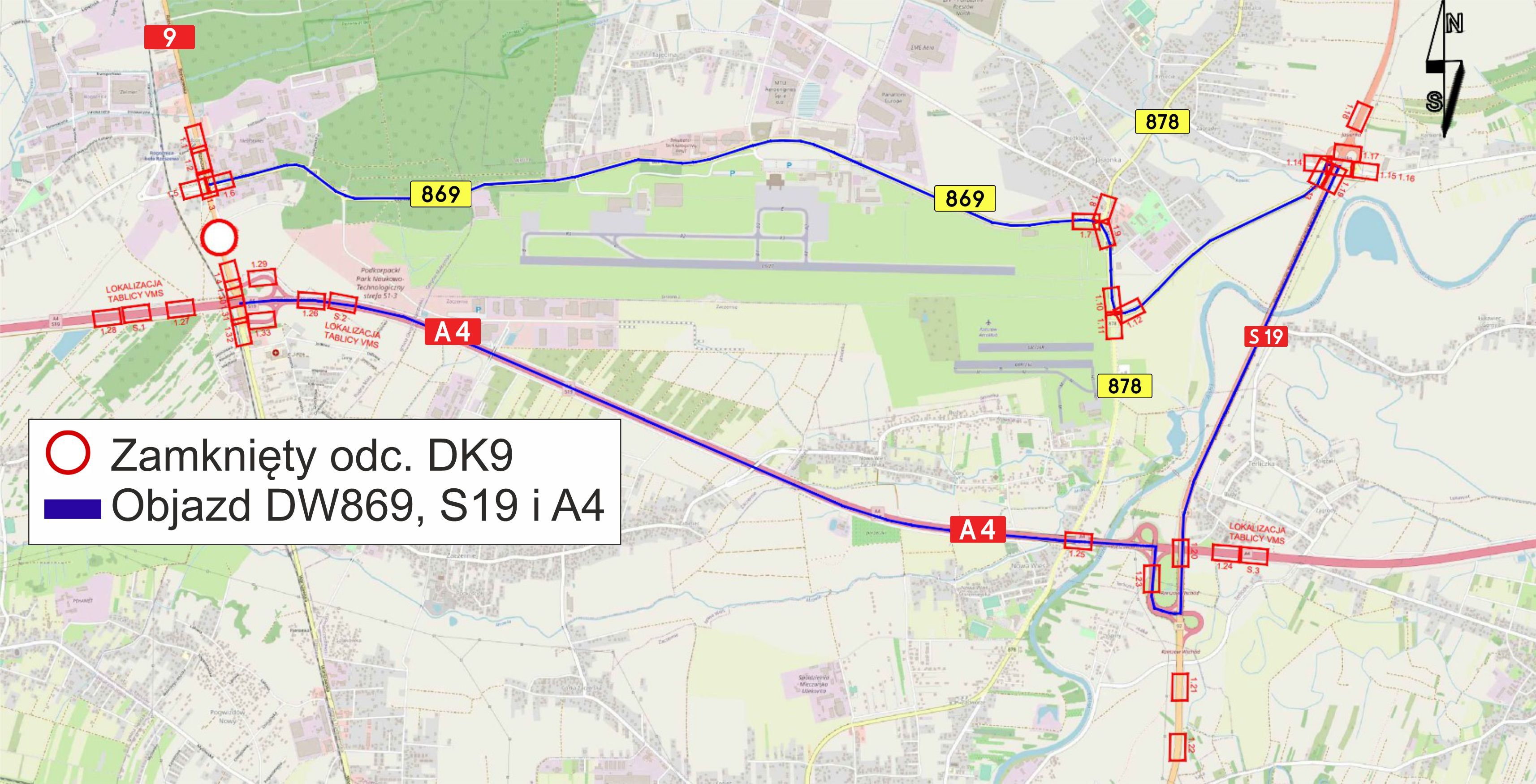 Po zjeździe z autostrady A4 na węźle Rzeszów Północ, niemożliwe będzie podróżowanie DK9 w kierunku Głogowa Małopolskiego. Pojazdy jadące od Rzeszowa w stronę Głogowa Małopolskiego, będą kierowane objazdem, kolejno przez węzeł Rzeszów Wschód na A4, następnie drogę ekspresową S19 gdzie na węźle Jasionka możliwy będzie zjazd na DW869. Drogą wojewódzką kierowcy dojadą do DK9, gdzie na skrzyżowaniu możliwy będzie skręt w kierunku Głogowa Małopolskiego.
