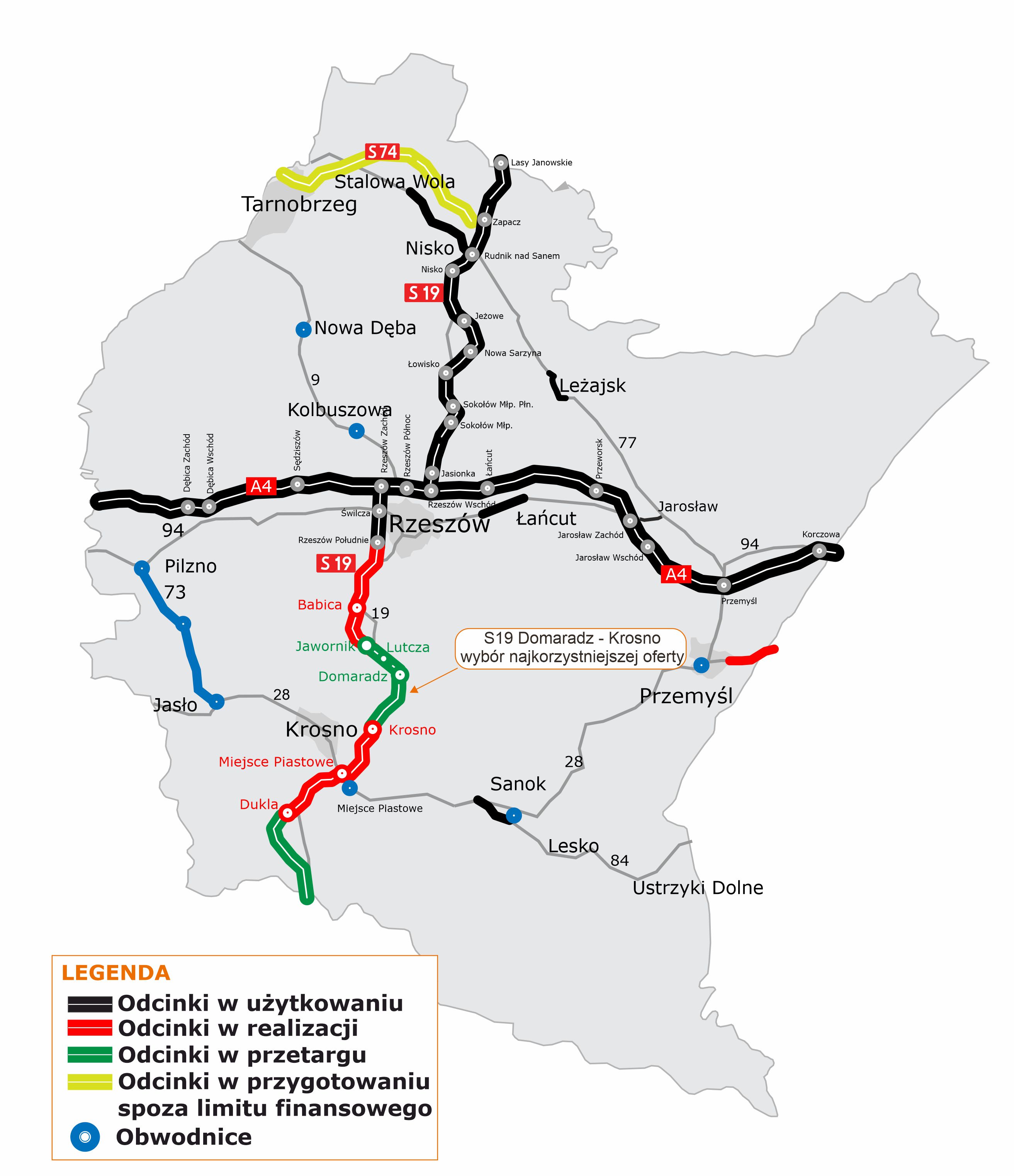 - 42,2 km - w realizacji (w budowie: Rzeszów Południe - Babica oraz w systemie Projektuj i buduj: Babica - Jawornik, Krosno - Miejsce Piastowe i Miejsce Piastowe - Dukla),