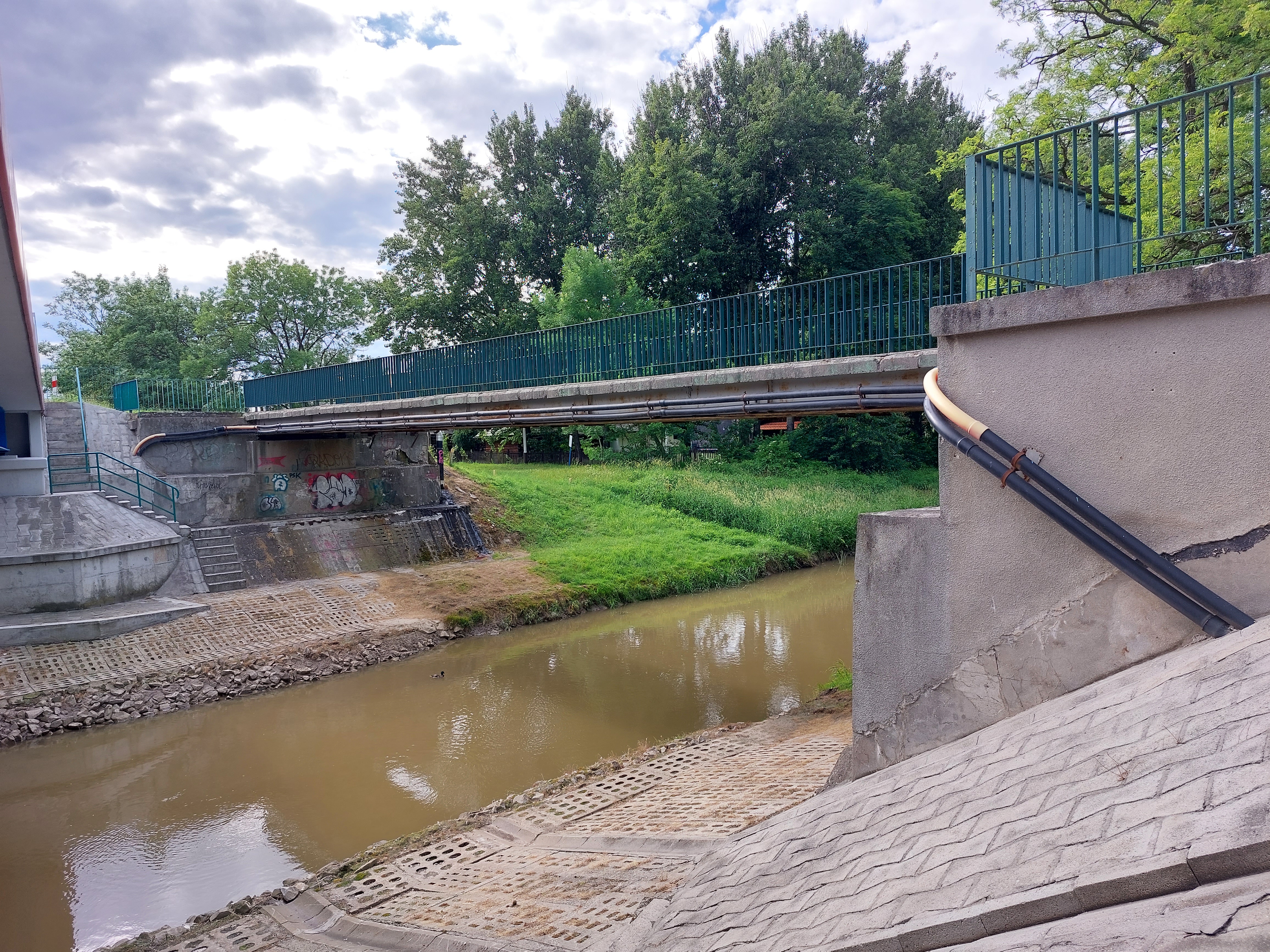 Istniejąca kładka została wybudowana w 1994r. Jest to obiekt jednoprzęsłowy belkowy swobodnie podparty. Ustrój nośny stanowią belki stalowe IPN 550, na których oparty jest pomost z prefabrykowanych płyt żelbetowych. Długość całkowita kładki wynosi 28,40 m, a szerokość 3,40 m. Przyczółki zostały wykonane jako pełnościenne posadowione bezpośrednio.