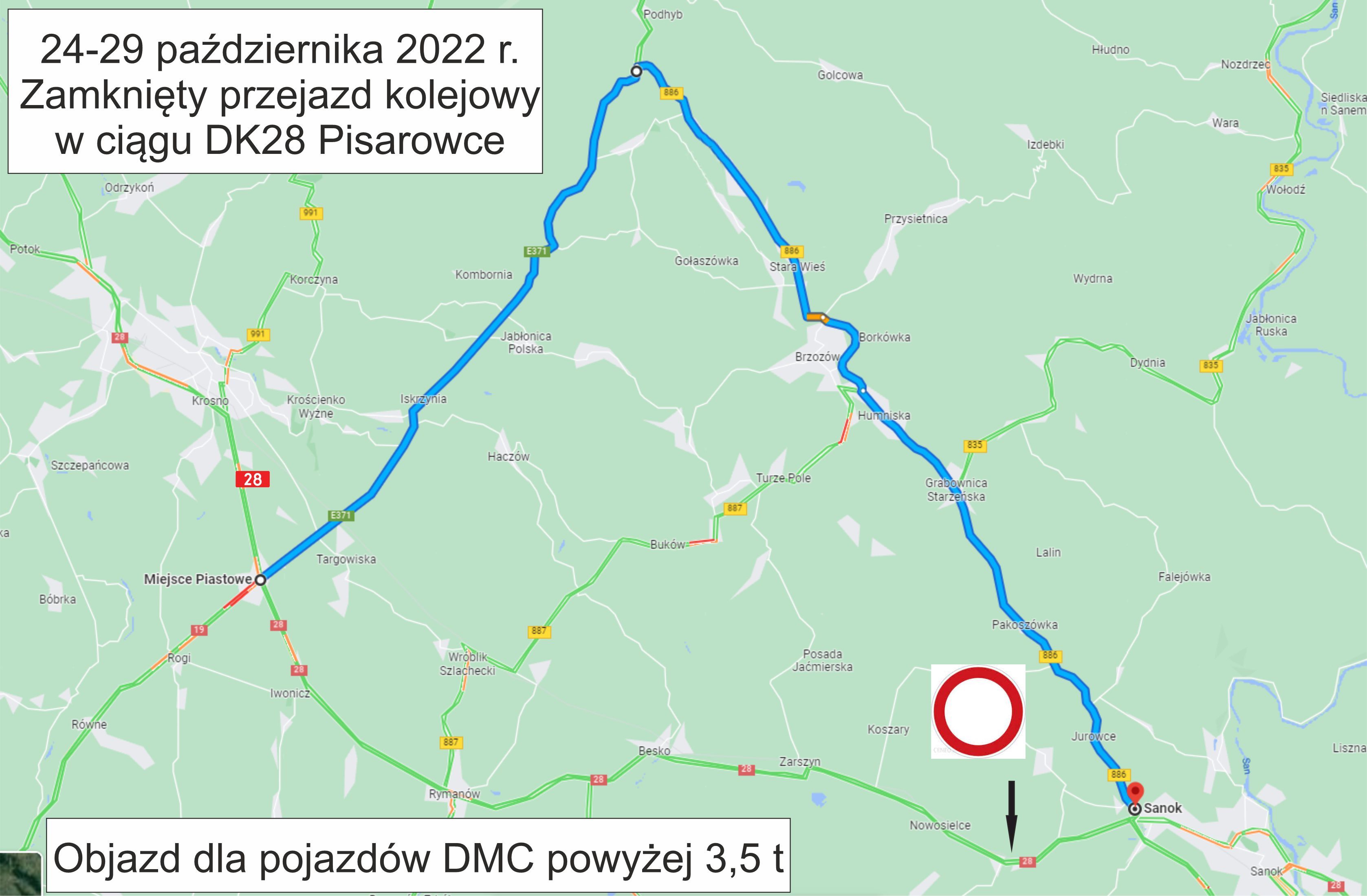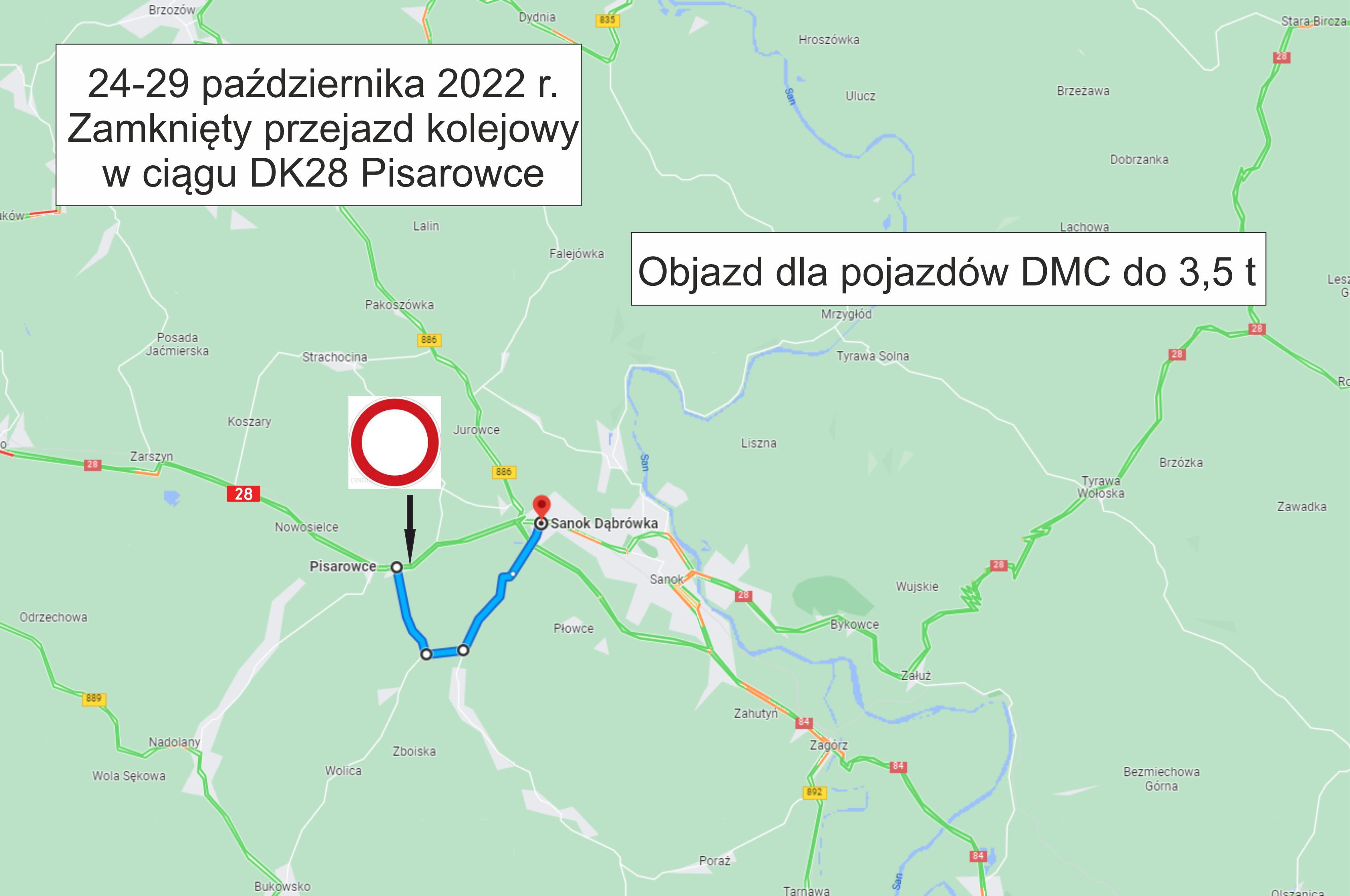 W dniach 24 - 29 października 2022 r. zostanie wprowadzona tymczasowa organizacja ruchu w związku z naprawą przejazdu kolejowego w m. Pisarowce prowadzonego przez PKP Polskie Linie Kolejowe.
