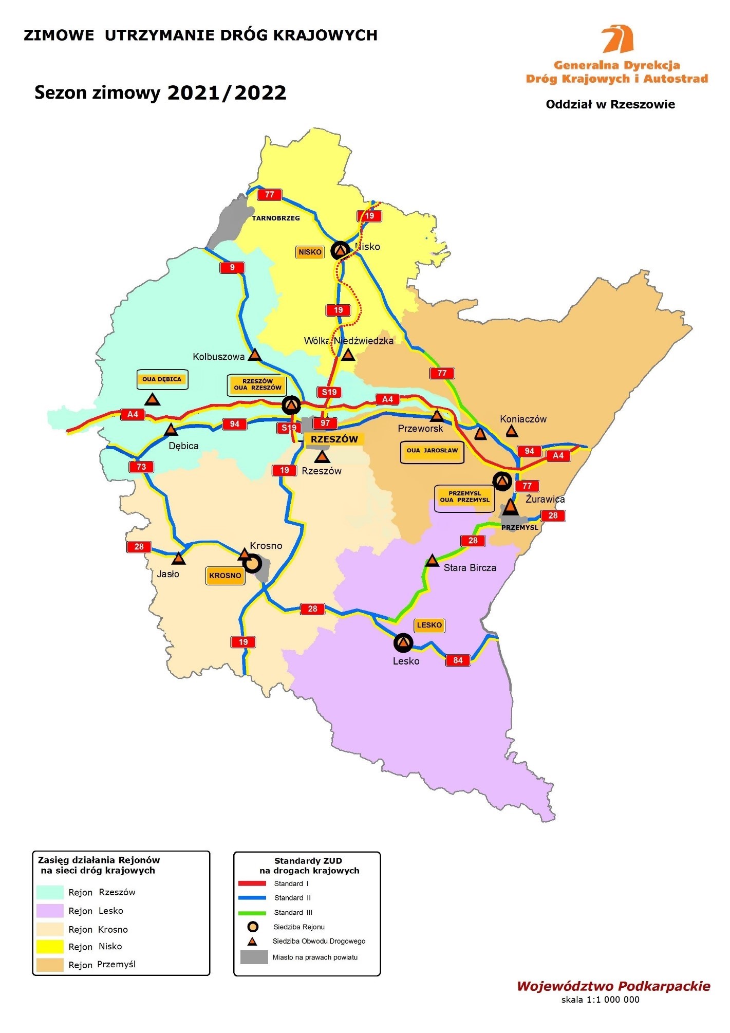 Stan dróg krajowych monitorujemy 24 godziny na dobę 7 dni w tygodniu, co pozwala na sprawną reakcję służb drogowych. Działaniami na drogach w województwie podkarpackim kieruje: 5 Rejonów oraz 16 Obwodów Drogowych (OD) w tym 4 Obwody Utrzymania Autostrady (OUA) oraz 2 Bazy Materiałowe (BM).