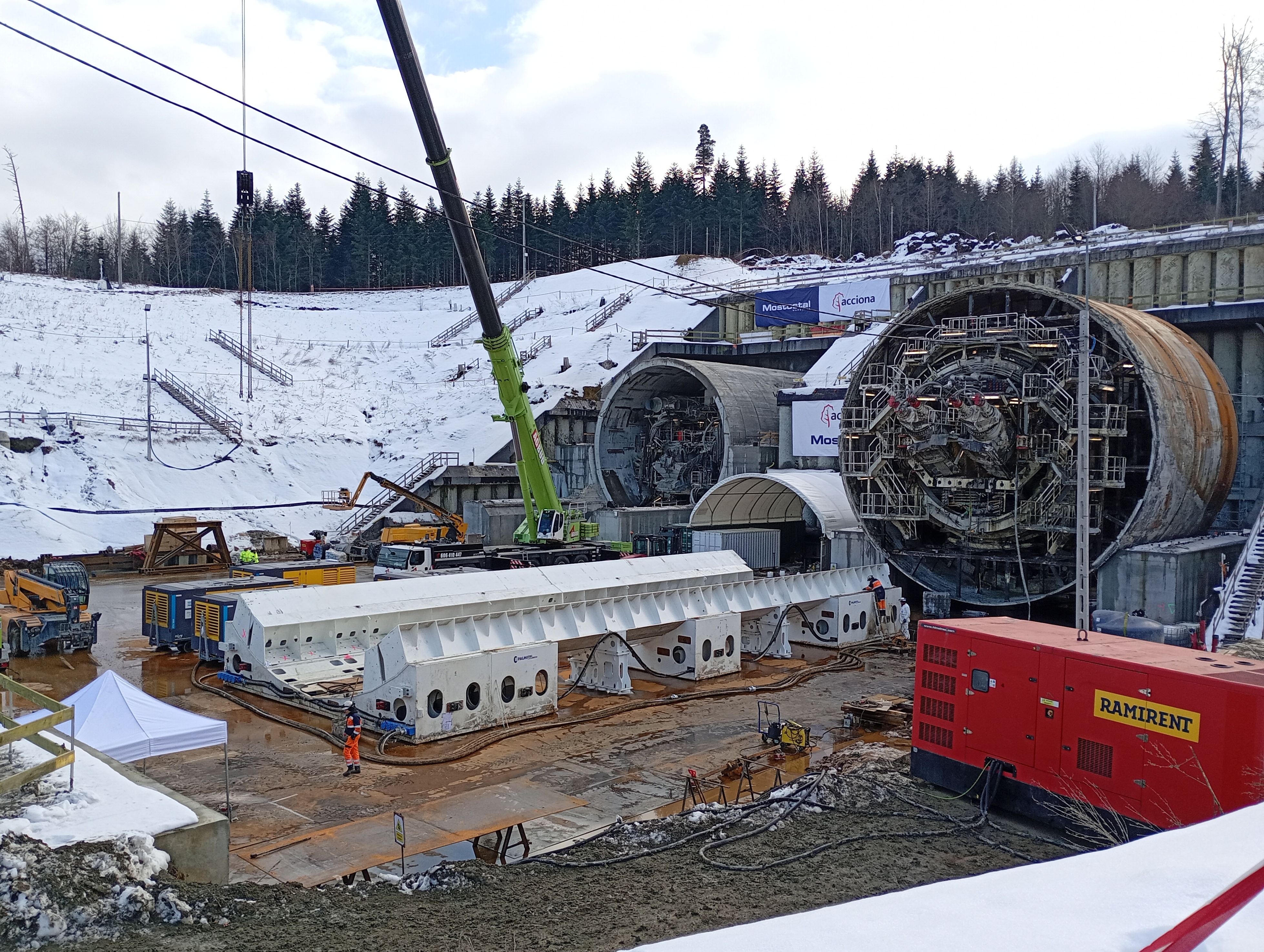 Na zdjęciu widać duży, zimowy plac budowy tunelu drogowego. Przed ścianą wykutą w zboczu znajdują się dwa ogromne, okrągłe otwory tunelowe. W każdym otworze stoi maszyna TBM – po lewej tarcza jest odsłonięta, a po prawej widać duży, brązowy, cylindryczny korpus. Przed nimi pracuje kilka żółtych i czerwonych maszyn budowlanych, a na ziemi poruszają się robotnicy w jaskrawych, odblaskowych ubraniach. Wokół placu znajduje się śnieg, a całość sprawia wrażenie intensywnych prac przy dużej inwestycji tunelowej.