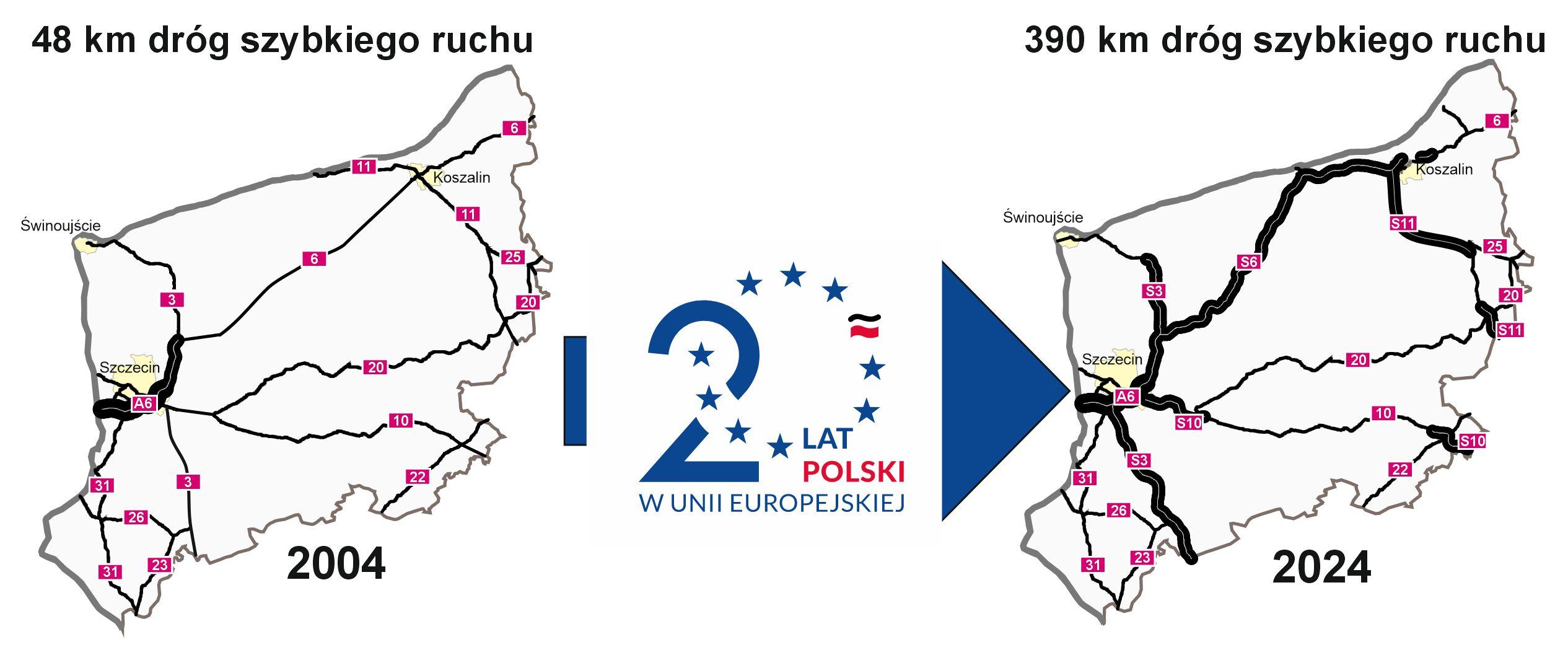 1 maja 2004 r. Polska wstąpiła do Unii Europejskiej. Wówczas w województwie zachodniopomorskim było zaledwie 48 km tras szybkiego ruchu. Po 20 latach dróg ekspresowych i autostrad mamy już 390 km, czyli osiem razy więcej. Ten ogromny postęp możliwy był w znacznej mierze dzięki współfinansowaniu inwestycji z Unii Europejskiej. Łączna kwota dofinansowania ze środków UE dla 15 projektów zrealizowanych w ciągu ostatnich 20 lat to 5,23 miliarda złotych, przy całkowitej wartości inwestycji wynoszącej 10,67 miliarda złotych.