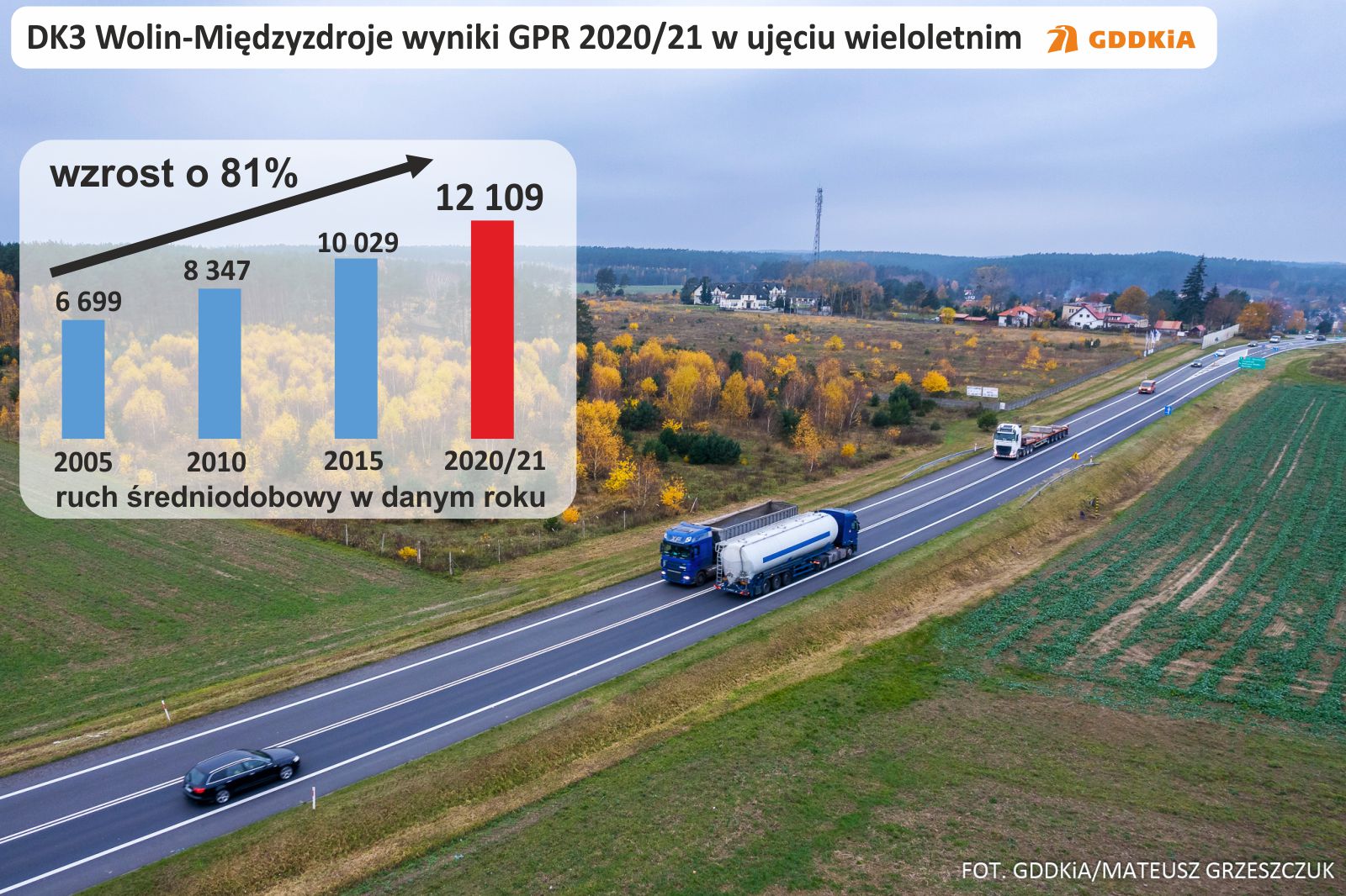 Co 5 lat na sieci dróg krajowych zarządzanej przez GDDKiA wykonywany jest generalny pomiar ruchu drogowego (GPR). W latach 2020-2021, w zależności od punktu, odbyło się od 6 do 13 sesji pomiarowych, w tym pomiary nocne. Harmonogram pomiarów był tak dostosowywany, aby zminimalizować wpływ pandemii na wyniki. W województwie zachodniopomorskim punktów pomiarowych było ponad 100. Wyniki GPR służą przede wszystkim do planowania rozwoju sieci drogowej oraz podejmowania decyzji o remontach i przebudowach. Są również podstawą do wykonywania prognoz ruchu drogowego.