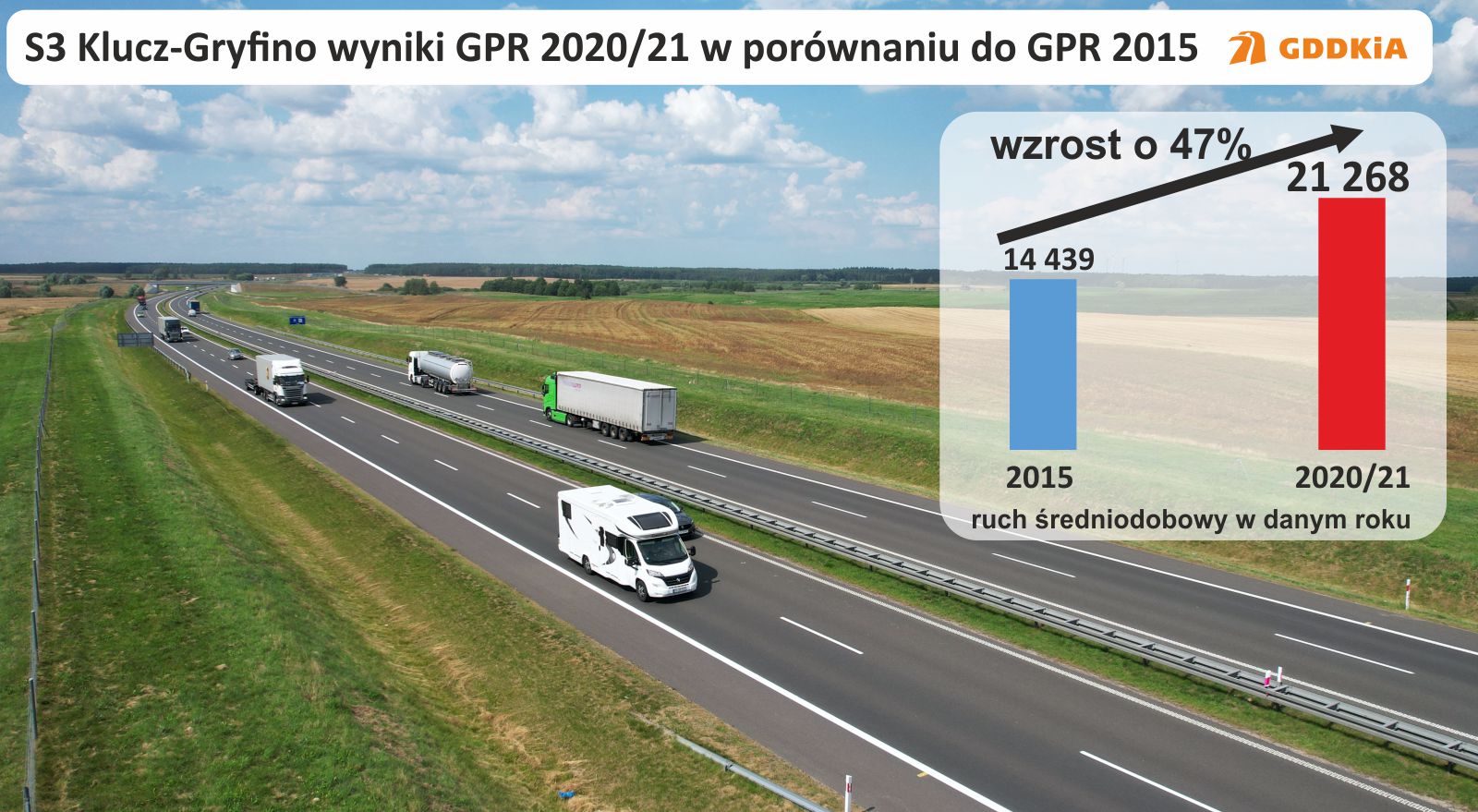 Znaczące wzrosty ruchu zaobserwowano na drodze ekspresowej S3 od Szczecina w kierunku Gorzowa Wielkopolskiego, co ma związek z oddawaniem do ruchu w ostatnich latach kolejnych odcinków tej trasy, jak i również oddaniem do ruchu w roku 2019 drogi ekspresowej S6 Goleniów - Koszalin. Na odcinku od Szczecina do węzła Pyrzyce ruch wzrósł w porównaniu z 2015 rokiem o 47 proc. i przekroczył 21 tys. pojazdów na dobę.