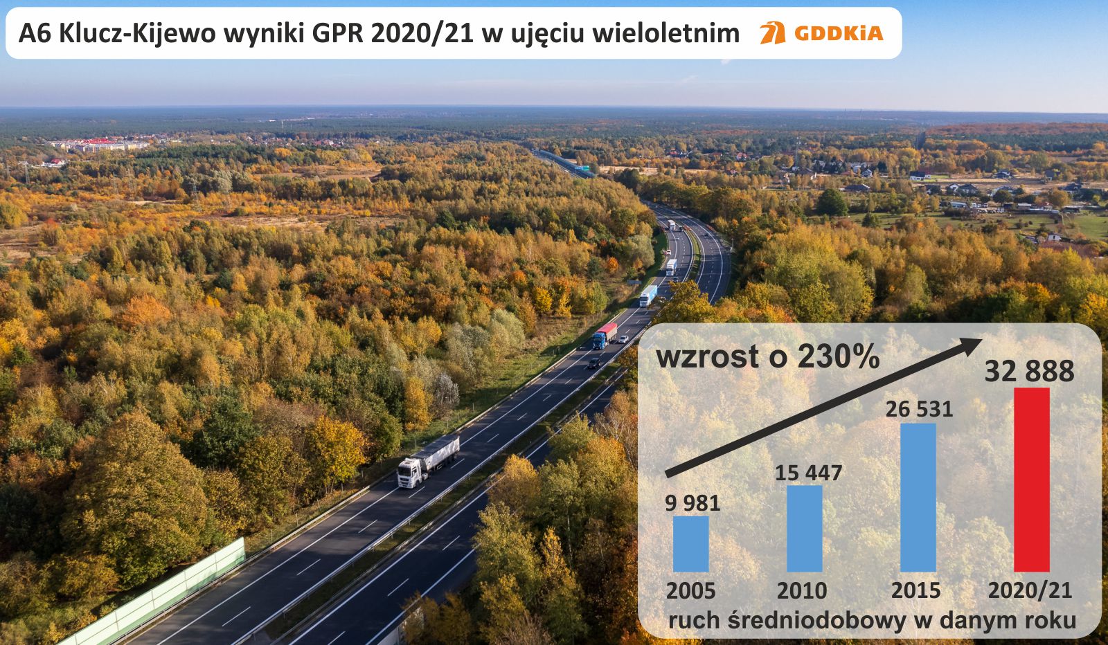 Wykonywane co 5 lat pomiary ruchu dają również możliwość porównania wzrostów natężeń ruchu drogowego w perspektywie wieloletniej. Patrząc 15 lat wstecz, autostradą A6 od Radziszewa do Kijewa jeździło niespełna 10 tys. pojazdów na dobę, a obecnie ten ruch wynosi 32 tys. pojazdów. Ówczesną DK3 na południe od Szczecina, jeszcze przez Pyrzyce, jeździło 11 tys. pojazdów na dobę, a S3 obecnie mamy ruch sięgający 21 tys. pojazdów na dobę. DK3 od Świnoujścia do Międzyzdrojów poruszało się 4,4 tys. pojazdów na dobę, obecnie jest to niemal 12 tys. pojazdów na dobę. Podobne wzrosty, przekraczające często 100 proc. w ciągu 15 lat, mamy również na innych odcinkach dróg, przede wszystkim głównych trasach - A6, S3 i S6. Ruch znacząco wzrósł również na innych trasach, takich jak DK20, DK31 czy DK23. Dane te pokazują, że liczba pojazdów na naszych drogach gwałtownie wzrasta. Dlatego tak ważny jest ciągły rozwój sieci drogowej, aby nadążyć za potrzebami generowanymi przez rosnący ruch drogowy.