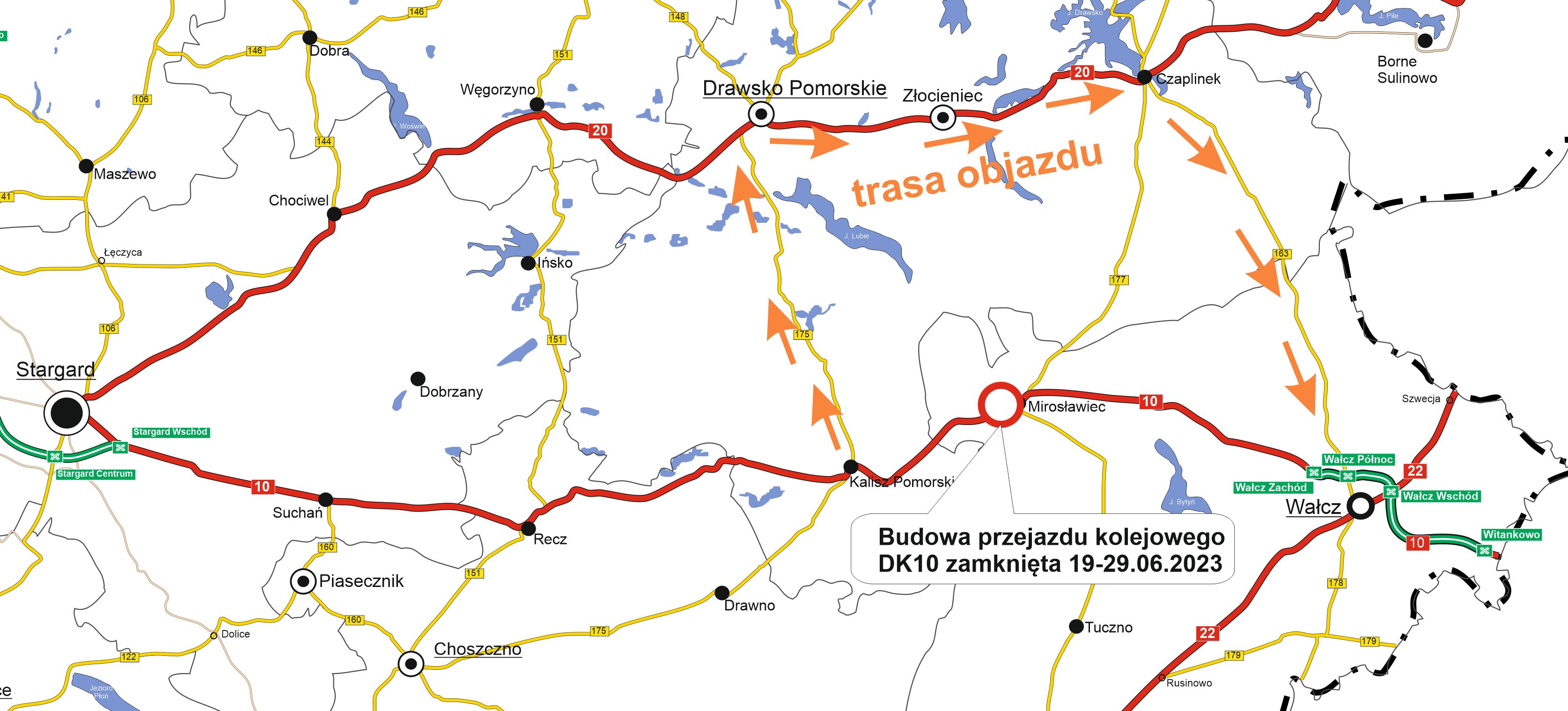 Od 19 do 29 czerwca, ze względu na realizowaną na zlecenie PKP budowę przejazdu kolejowego na ul. Wolności w Mirosławcu - DK10 w tym miejscu będzie zamknięta. Kierowcy będą musieli jechać objazdem od Kalisza Pomorskiego DW175 do Drawska Pomorskiego, następnie DK20 do Czaplinka i dalej DW163 do Wałcza. To jedyny możliwy objazd w tym rejonie, którym może poruszać się cały ruch drogowy.