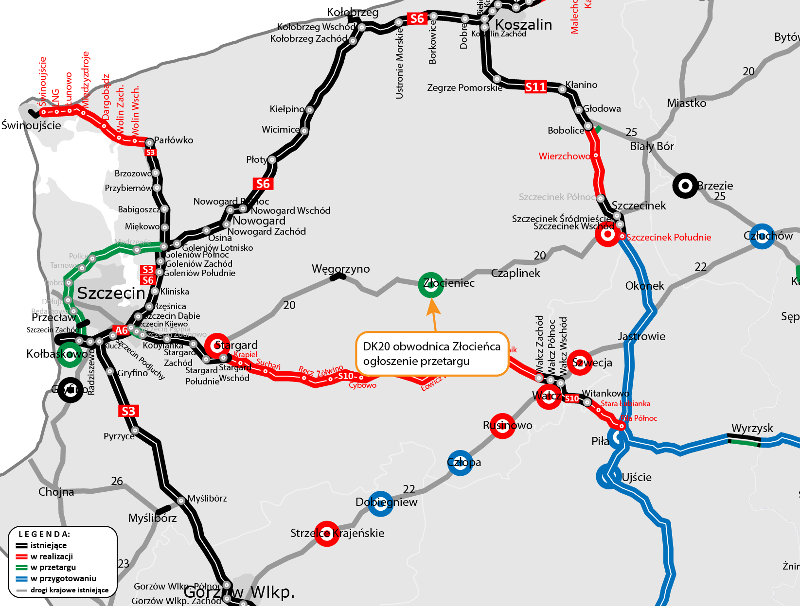 W rozpisanym na lata 2020-2030 rządowym Programie budowy 100 obwodnic, poza obwodnicą Złocieńca, znajduje się jeszcze osiem inwestycji na Pomorzu Zachodnim. 17 grudnia tego roku została otwarta pierwsza z obwodnic – Gryfina na DK31. Prace przy obwodnicy Szczecinka w ciągu DK20 są już na ukończeniu i inwestycja ma być gotowa w II kwartale przyszłego roku. W tym roku podpisaliśmy umowy na zaprojektowanie i budowę czterech innych obwodnic – Szwecji, Rusinowa i Wałcza na DK22 oraz Stargardu na DK20. Dla obwodnicy Szwecji przygotowano już projekt budowlany i w ubiegłym tygodniu złożyliśmy wniosek o wydanie decyzji ZRID.