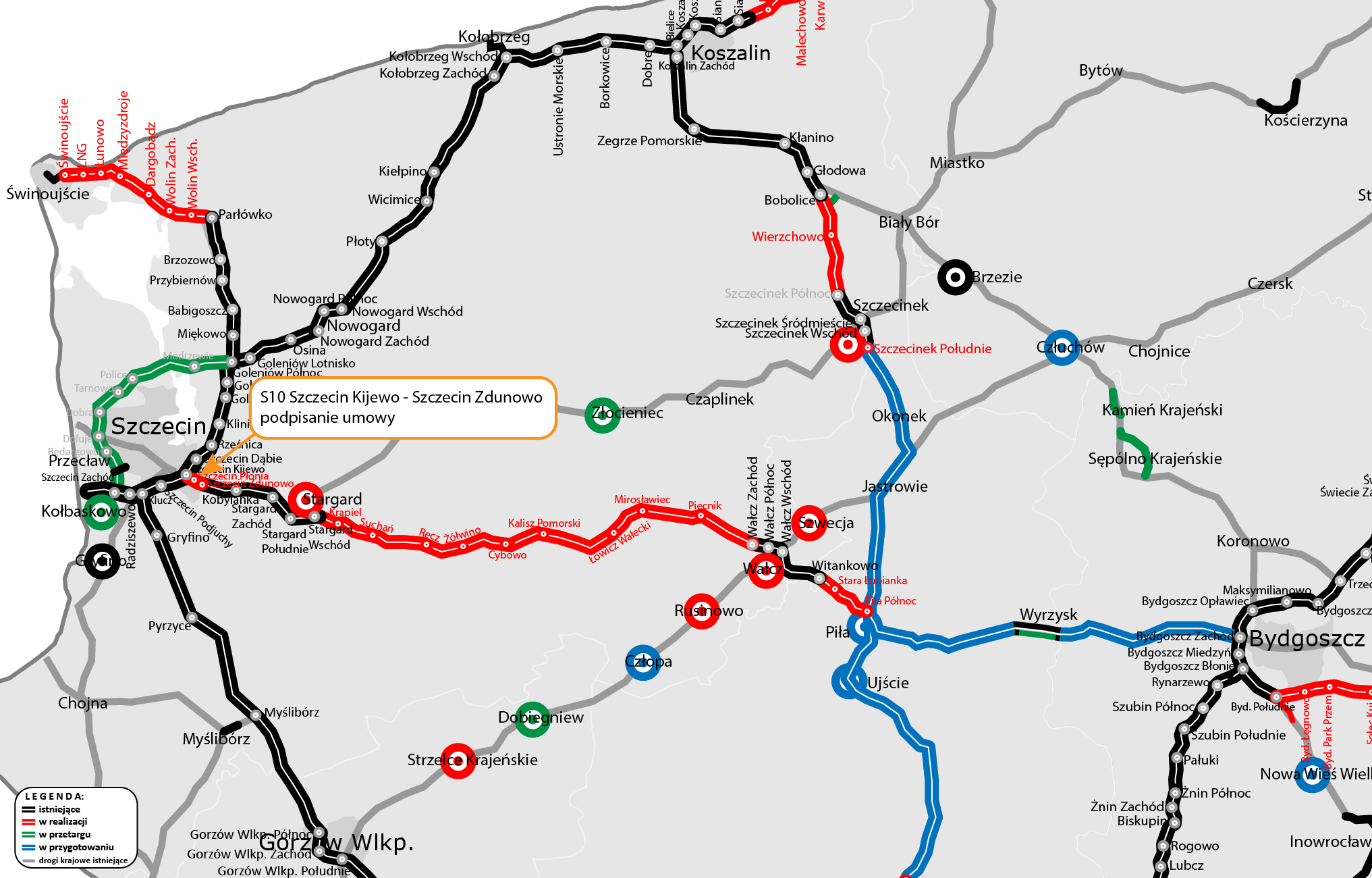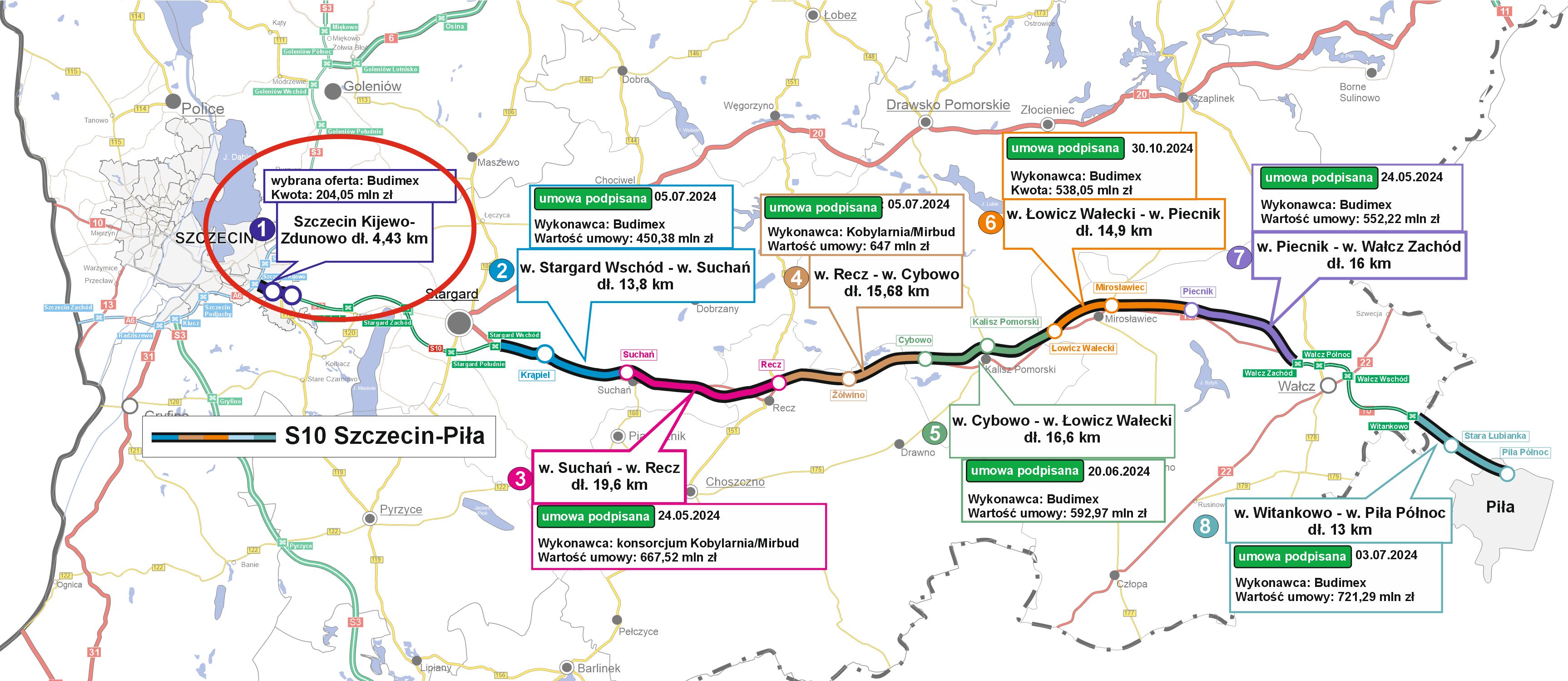 W ubiegłym roku sukcesywnie podpisywaliśmy umowy na zaprojektowanie i budowę kolejnych odcinków S10 Szczecin - Piła. Wraz z podpisaniem umowy na odcinek Szczecin Kijewo - Szczecin Zdunowo wszystkie osiem odcinków jest już w realizacji. Łącznie to 113,4 km dwujezdniowej drogi ekspresowej z trzynastoma węzłami drogowymi, 56 wiaduktami, ośmioma estakadami i 20 górnymi przejściami dla zwierząt, trzema parami Miejsc Obsługi Podróżnych oraz dwoma obwodami utrzymania drogi ekspresowej.