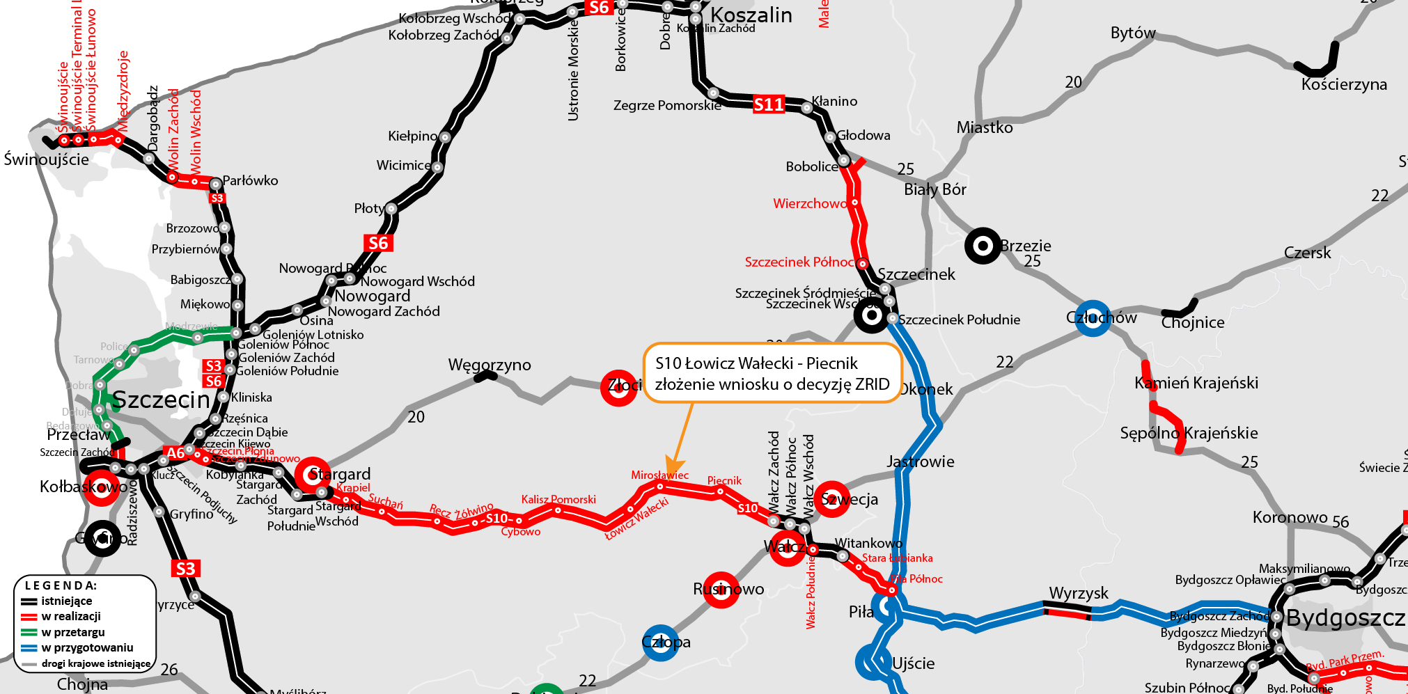 Do Wojewody Zachodniopomorskiego złożyliśmy wniosek o wydanie decyzji o zezwoleniu na realizację inwestycji drogowej (ZRID) dla odcinka drogi ekspresowej S10 Łowicz Wałecki - Piecnik. To już szósty odcinek zachodniopomorskiej S10 z wnioskiem o tę decyzję. Przy sprawnym przebiegu procedur administracyjnych, decyzję ZRID powinniśmy otrzymać na przełomie I i II kwartału przyszłego roku. Pozwoli to na rozpoczęcie robót budowlanych i procedury odszkodowawczej za przejmowane na rzecz Skarbu Państwa nieruchomości.