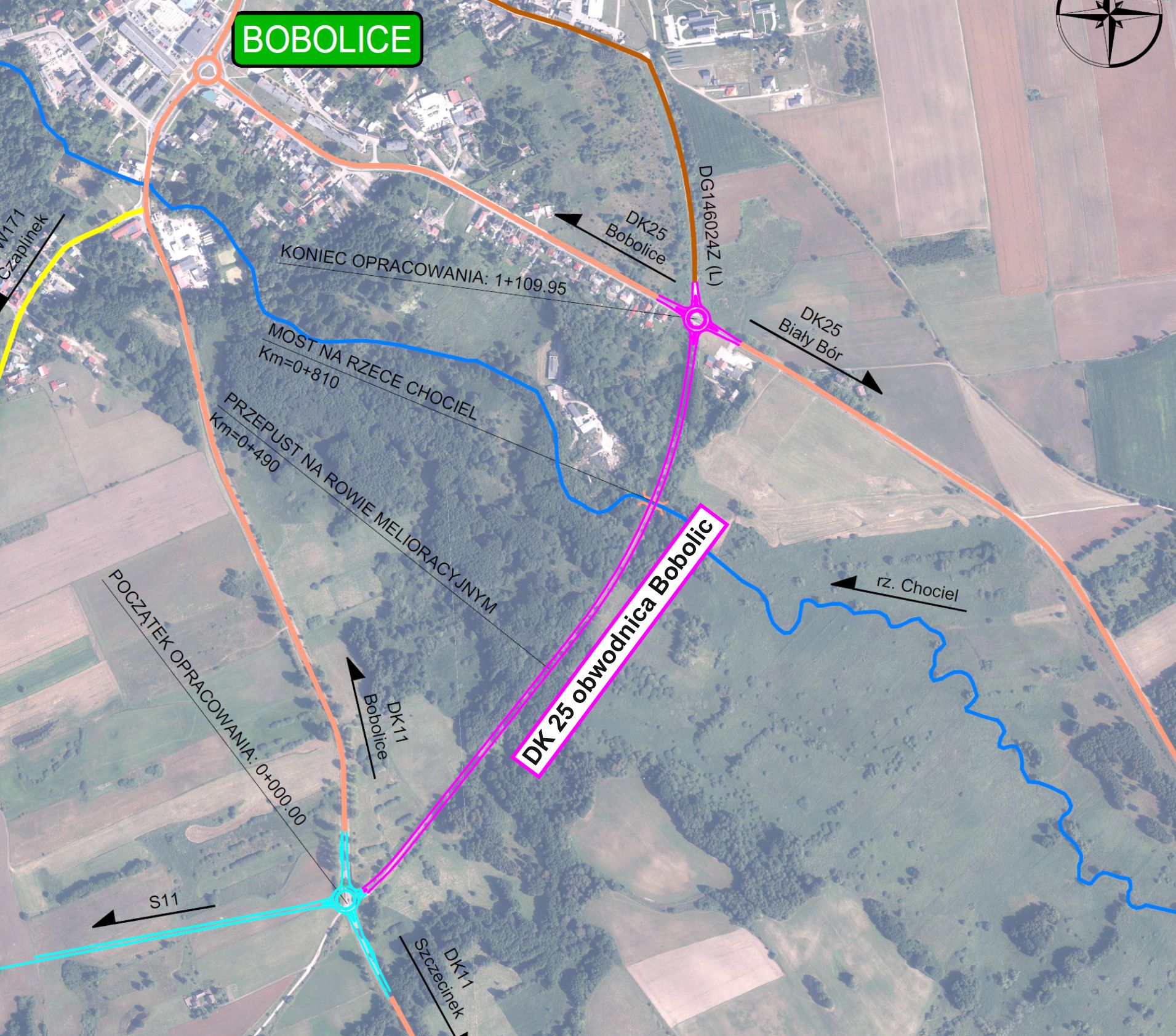 Obwodnica rozpocznie się w rejonie obecnego skrzyżowania DK25 z ul. Polną. Na wjeździe do Bobolic, od strony Białego Boru, powstanie rondo. Nowa droga będzie od tego miejsca biegła w kierunku południowo-zachodnim przez dolinę rzeki Chociel, gdzie powstanie most na rzece oraz przepust na rowie melioracyjnym. Zakończeniem drogi będzie rondo, które zostało wybudowane na połączeniu układu drogowego węzła Bobolice z obecną DK11. Obwodnica będzie poprowadzona w śladzie rozebranej w 1945 roku linii kolejowej. Wzdłuż całej obwodnicy powstanie ścieżka pieszo-rowerowa o szerokości 3 m i nawierzchni bitumicznej.