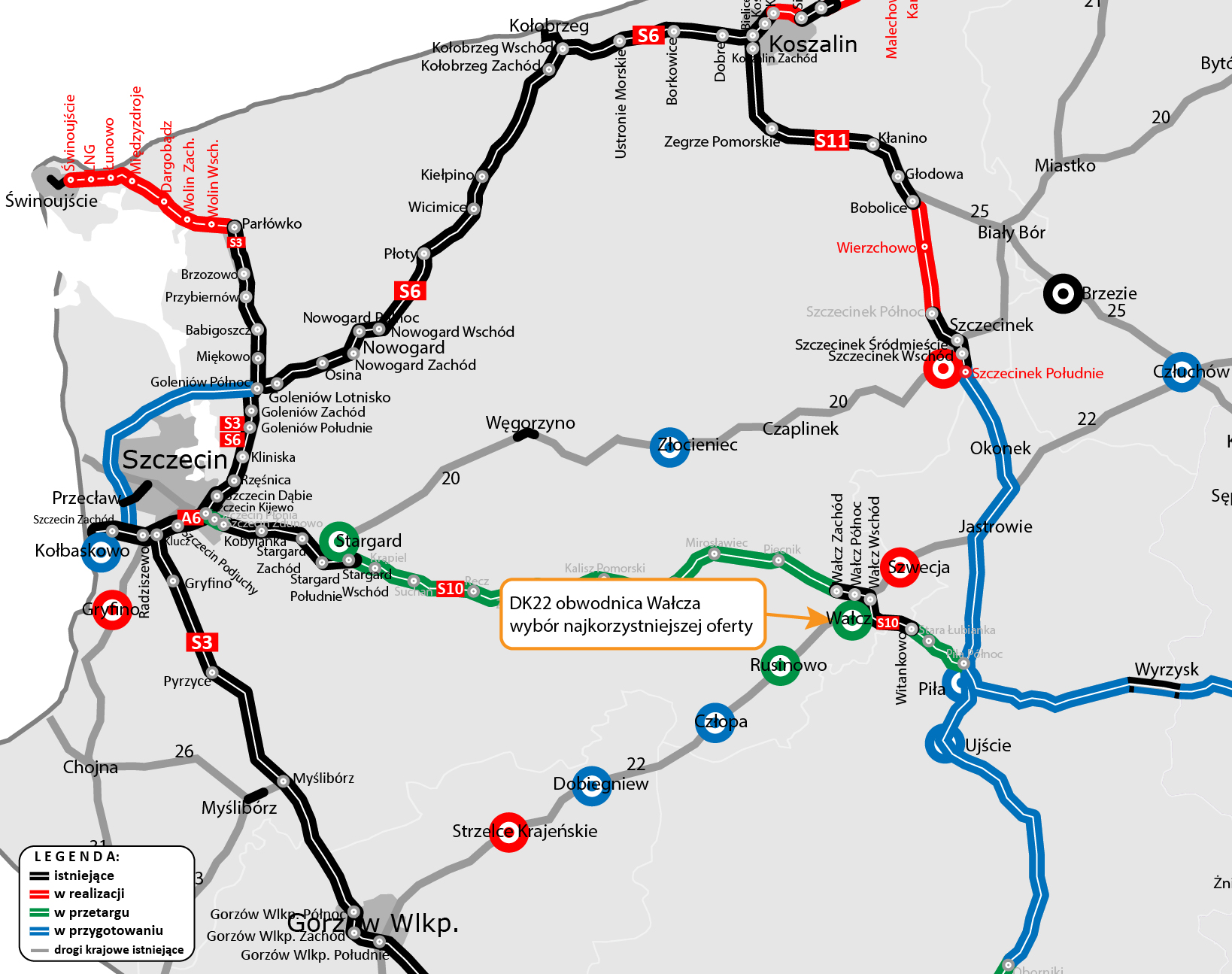 W listopadzie ubiegłego roku ogłosiliśmy przetarg na realizację obwodnicy Rusinowa w ciągu DK22. W grudniu ruszył przetarg dla obwodnicy Stargardu w ciągu DK20. Dla obu tych inwestycji poznaliśmy już oferty wykonawców i trwa ich weryfikacja. W tym roku planowany jest przetarg na obwodnicę Złocieńca w ciągu DK20. Dla obwodnicy Człopy w ciągu DK22, która jako ostatnia ze wszystkich zachodniopomorskich inwestycji z Programu 100 obwodnic uzyskała decyzję środowiskową, rozstrzygane jest jeszcze przez Samorządowe Kolegium Odwoławcze odwołanie od tej decyzji.
