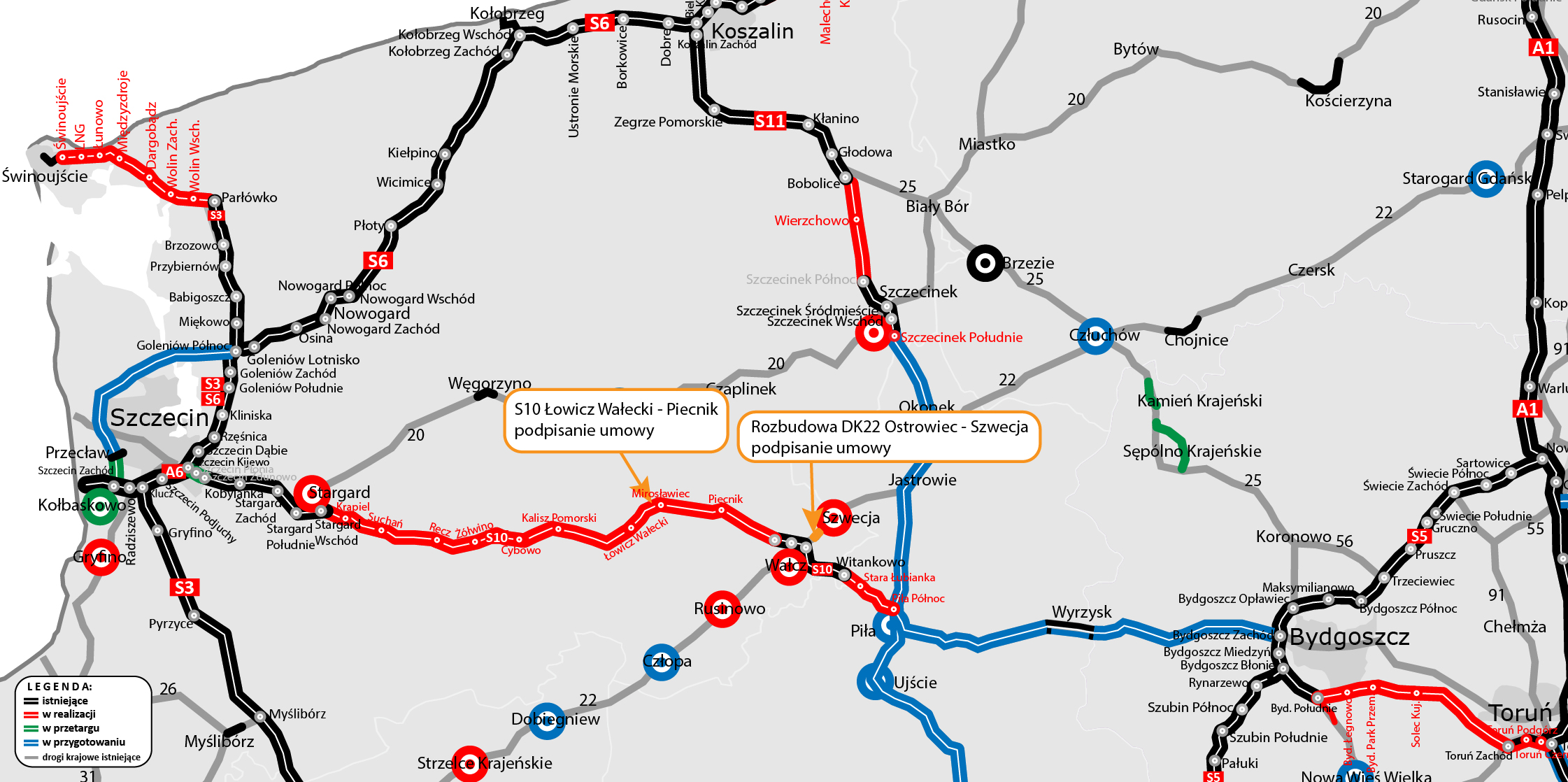 W ramach Rządowego Programu Budowy Dróg Krajowych do 2030 roku zrealizujemy między innymi drogę ekspresową S10 Szczecin - Piła. Trasa składa się z ośmiu odcinków o łącznej długości 113,4 km. Po podpisaniu umowy na fragment S10 Łowicz Wałecki - Piecnik w przetargu pozostanie już tylko odcinek Szczecin Kijewo - Zdunowo. Dla tego pierwszego od strony zachodniej odcinka, Sąd Okręgowy w Warszawie na skutek skargi jednego z oferentów nakazał odrzucenie pierwotnie wybranej w przetargu oferty i ponowny wybór oferty najkorzystniejszej. Obecnie analizujemy oferty zgodnie z wyrokiem Sądu.