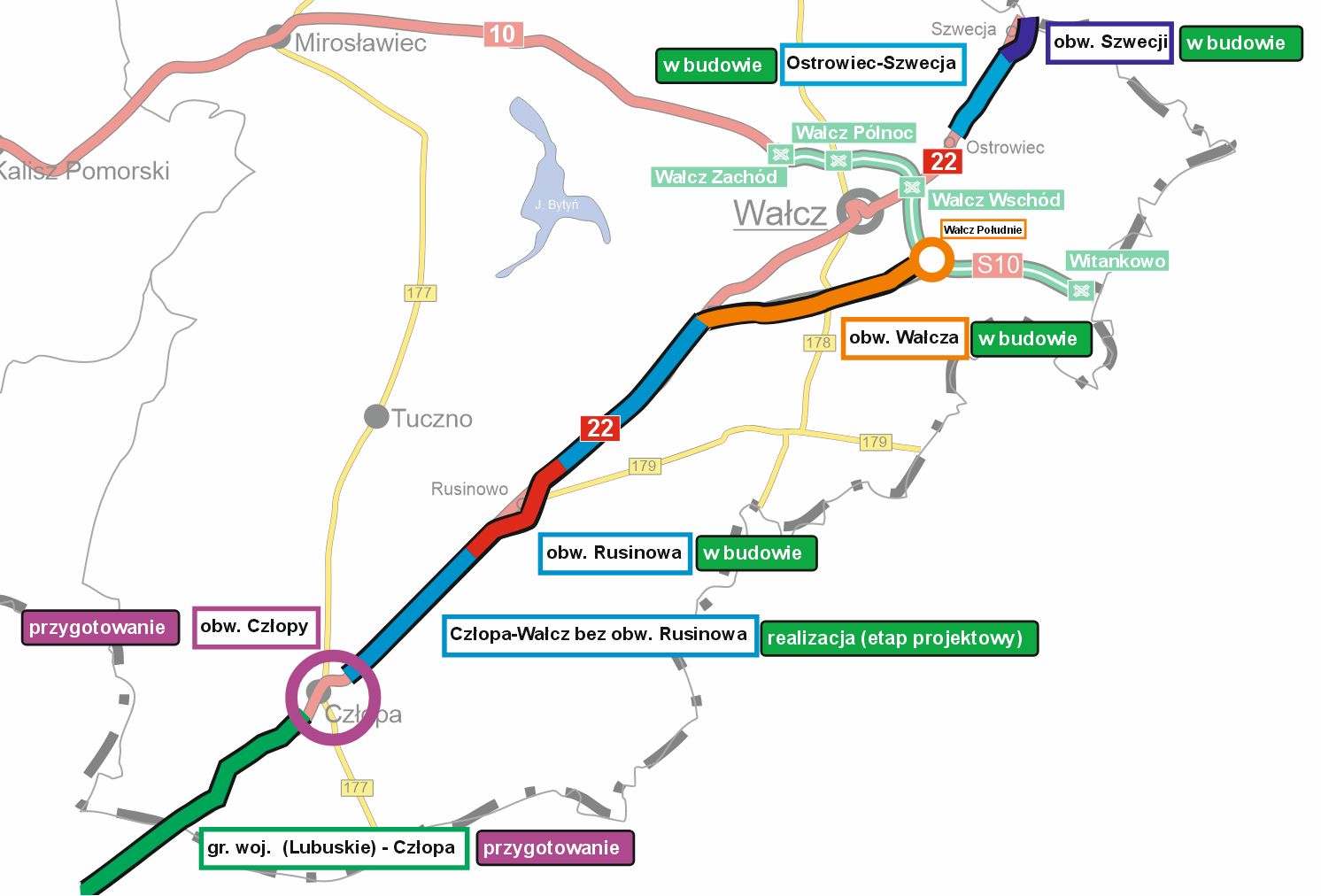W budowie jest obwodnica Szwecji. Wykonano już większość robót bitumicznych, prace są już mocno zaawansowane i oddanie do ruchu zgodnie z kontraktem powinno nastąpić w II kwartale przyszłego roku. W lipcu ubiegłego roku ruszyła budowa obwodnicy Rusinowa. Prace ziemne są już zaawansowane i zakończenie powinno nastąpić w III kwartale przyszłego roku. Jesienią ubiegłego roku rozpoczęła się również budowa obwodnicy Wałcza i tu zakończenie planowane jest w 2028 roku.