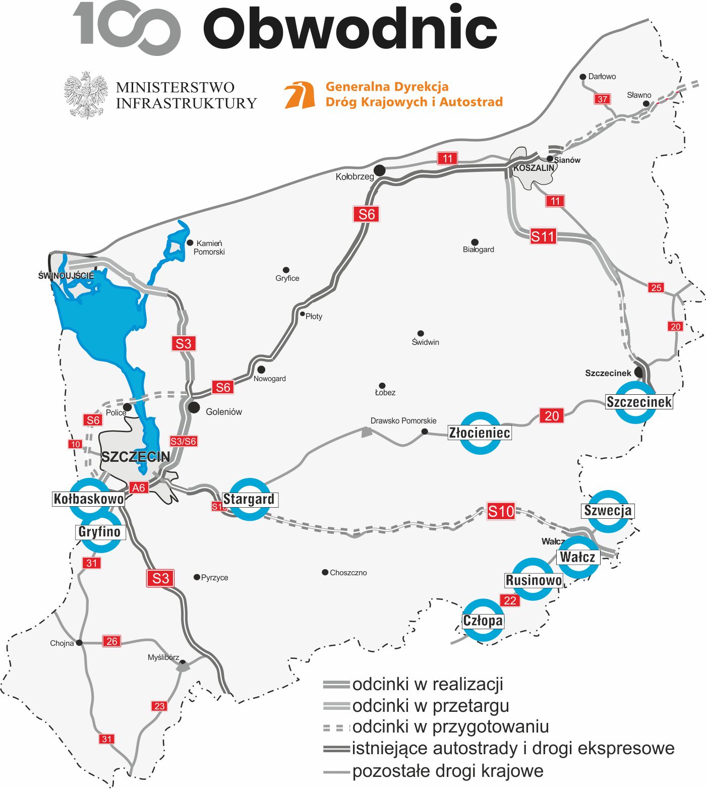 Dla obwodnic Wałcza i Szwecji na DK22 trwa już uzyskiwane decyzji środowiskowych, dla obwodnicy Rusinowa na DK22 wniosek o wydanie tej decyzji powinien zostać złożony w najbliższych tygodniach. Z kolei dla obwodnic Stargardu i Złocieńca na DK20 trwa opracowywanie dokumentacji studialnej.