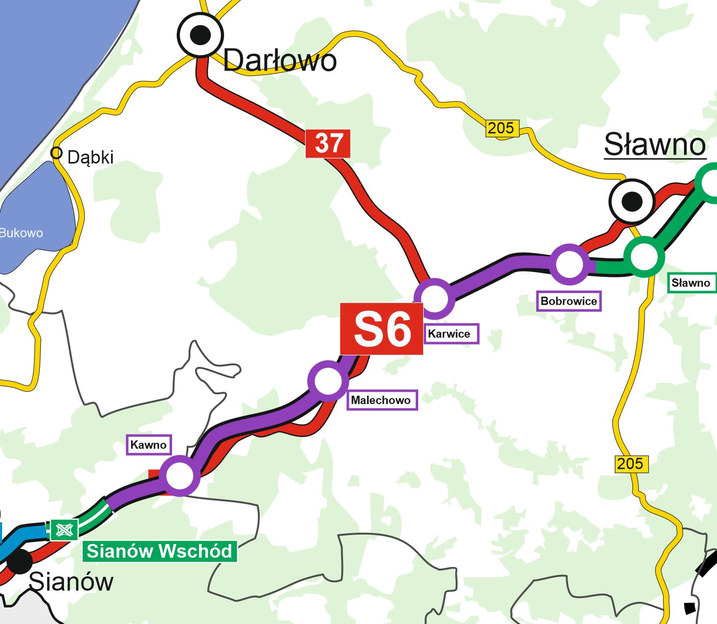 W ramach całego, 46-kilometrowego odcinka powstanie aż osiem węzłów drogowych (Kawno, Malechowo, Karwice i Bobrowice Sławno, Warszkowo, Wrześnica, Sycewice) oraz dwa Miejsca Obsługi Podróżnych II kategorii (Karwice Północ i Karwice Południe). Będzie to dwujezdniowa droga ekspresowa z dwoma pasami ruchu w obu kierunkach. Droga S6 Koszalin - Słupsk wyposażona zostanie w nowoczesne urządzenia do zarządzania ruchem, urządzenia ochrony środowiska oraz elementy związane z bezpieczeństwem ruchu na drodze. Ponadto powstanie sieć teleinformatyczna umożliwiająca sprawne i szybkie komunikowanie zdarzeń do Punktu Informacji Drogowej. Planowane rozpoczęcie prac budowanych będzie miało miejsce jesienią przyszłego roku. Nowa droga powinna zostać udostępniona kierowcom w 2025 r.