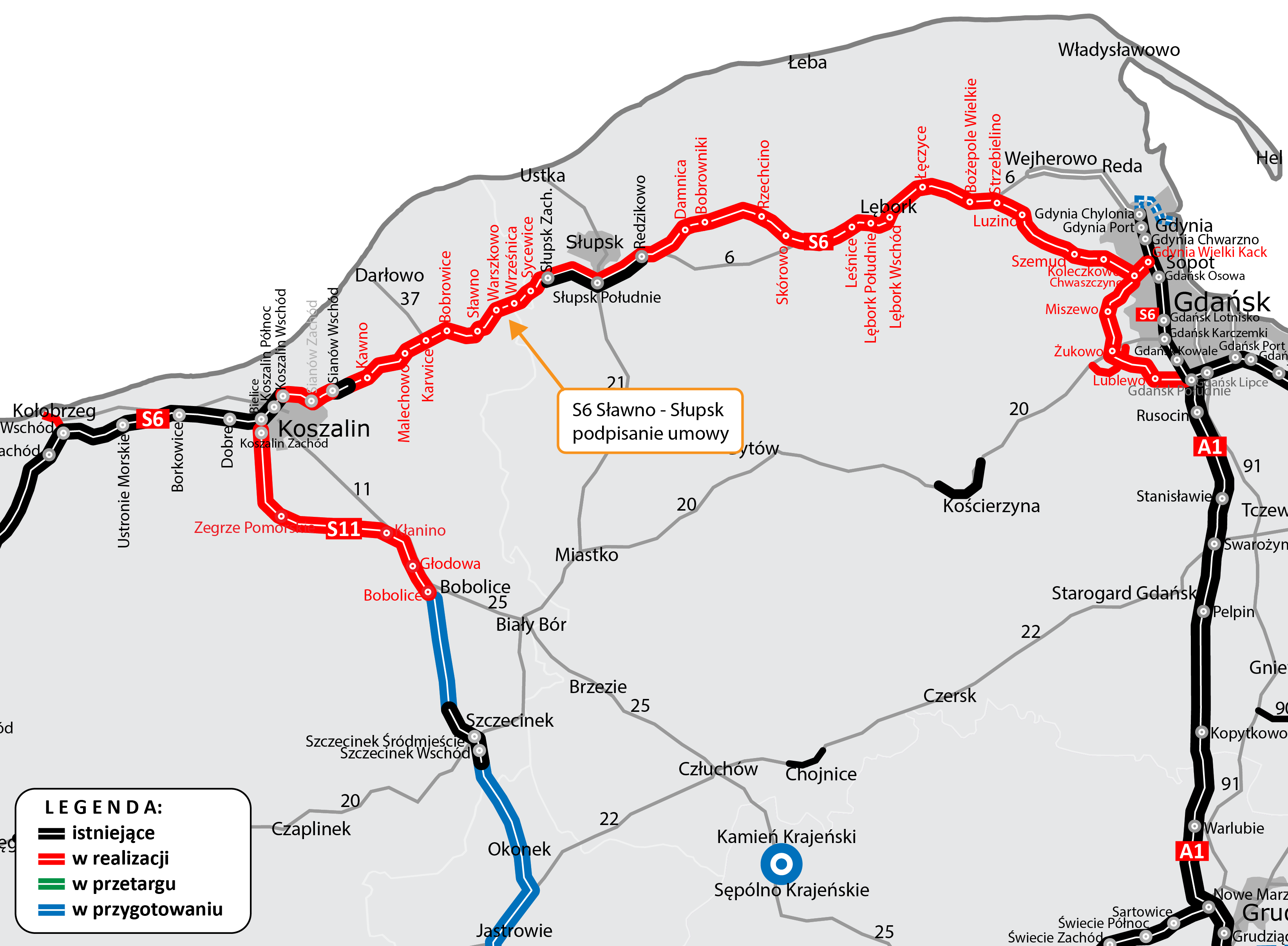 Umowy na realizację pozostałych odcinków S6 w województwie pomorskim, łącznie z obwodnicą Metropolii Trójmiejskiej, zostały podpisane w ubiegłym roku. Zakończenie realizacji tych fragmentów planowane jest w 2025 roku. Również w 2025 roku zaplanowane jest zakończenie realizacji dwóch ostatnich odcinków S6 w województwie zachodniopomorskim Koszalin - Sławno i Sławno - Słupsk. Wówczas powinna zacząć funkcjonować całość ekspresowego połączenia Szczecina z Gdańskiem wzdłuż wybrzeża bałtyckiego o długości około 300 km.