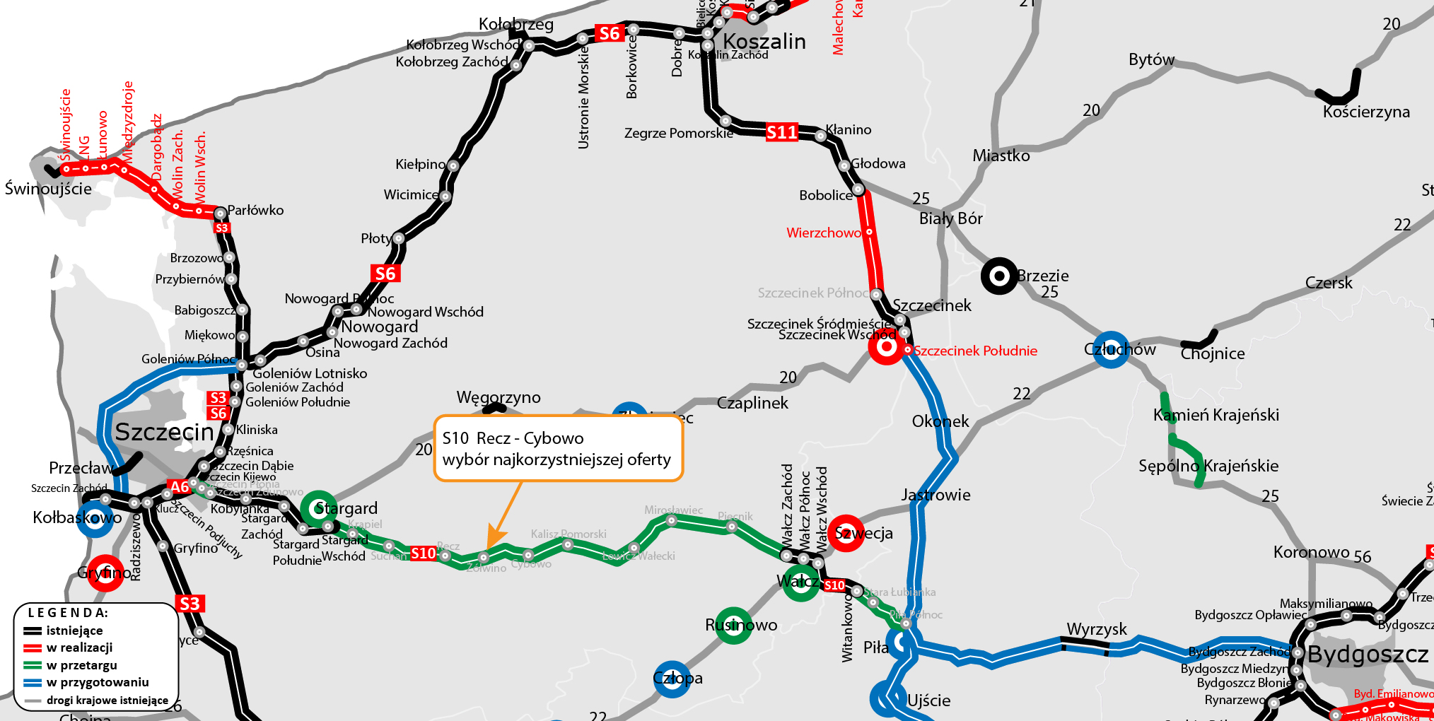 Obecnie kierowcy oprócz wspomnianego wcześniej odcinka od Zdunowa (granica miasta Szczecin) do Stargardu oraz obwodnicy Wałcza w woj. zachodniopomorskim korzystają także z trzech innych odcinków S10. To obwodnica Wyrzyska (w części jednojezdniowa) w woj. wielkopolskim oraz Bydgoszcz Zachód – Bydgoszcz Południe i Toruń Zachód – Toruń Południe (jednojezdniowa) w woj. kujawsko-pomorskim. To w sumie ok. 60 km.