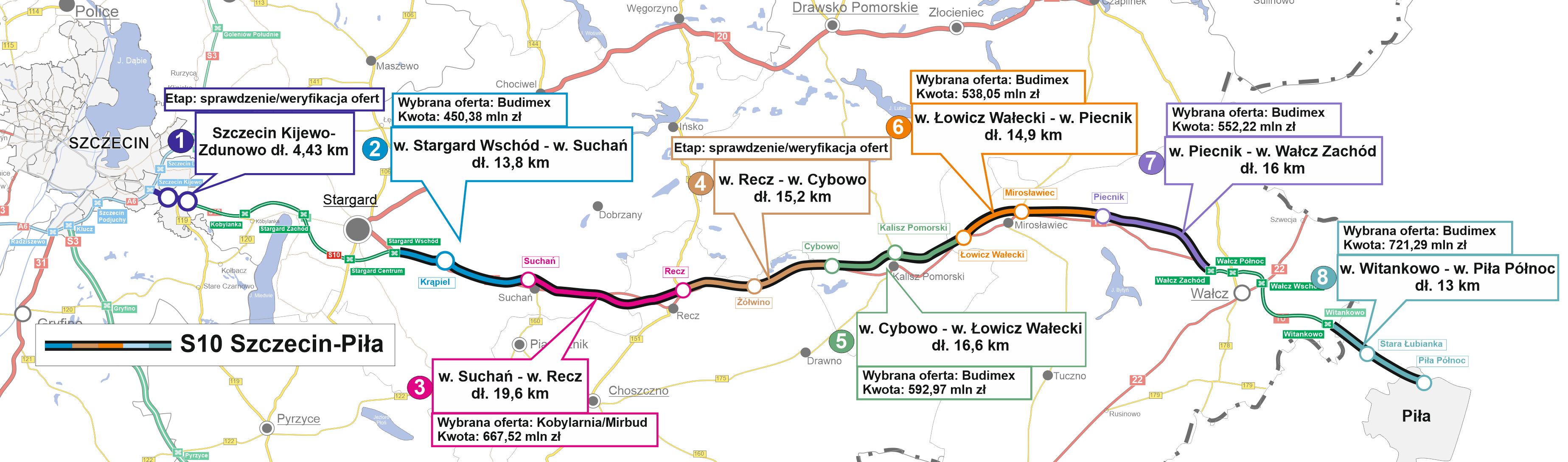 Suchań – Recz (dł. 19,6 km), wartość wybranej oferty: 667,52 mln zł, wykonawca: konsorcjum Kobylarnia i Mirbud