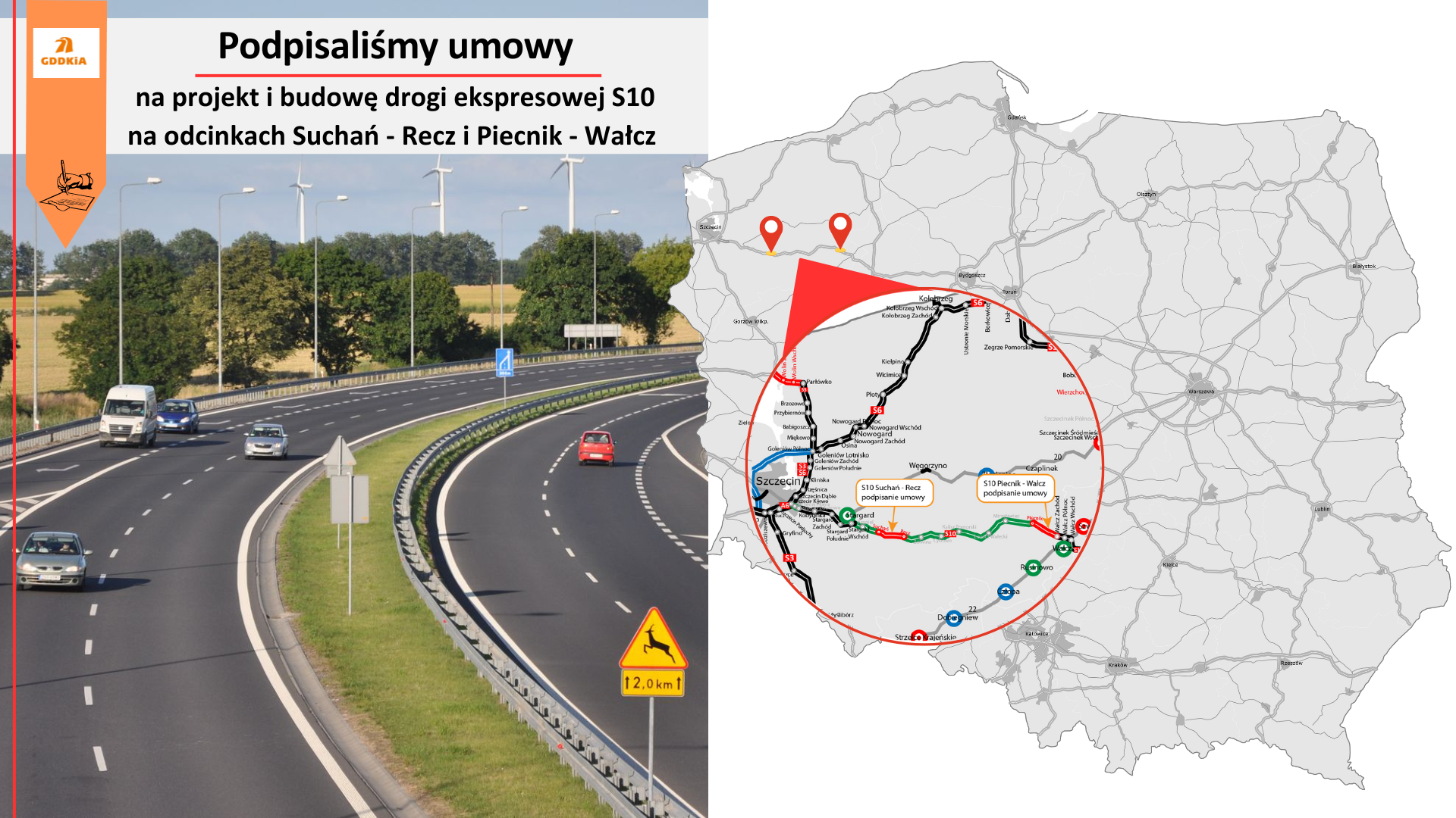Odcinek drogi S10 Suchań – Recz o długości 19,6 km wybuduje konsorcjum firm Kobylarnia i Mirbud za kwotę 667,52 mln złotych, a odcinek Piecnik – Wałcz o długości 16 km za kwotę 552,2 mln złotych firma Budimex. Podpisane umowy na zaprojektowanie i budowę są pierwszymi kontraktami na realizację odcinków S10 od Szczecina do Piły o łącznej długości około 113 km. Umowy dla pozostałych sześciu odcinków powinny być podpisane w ciągu najbliższych kilku tygodni. Zakończenie realizacji drogi S10 na terenie Pomorza Zachodniego planowane jest w 2028 roku.