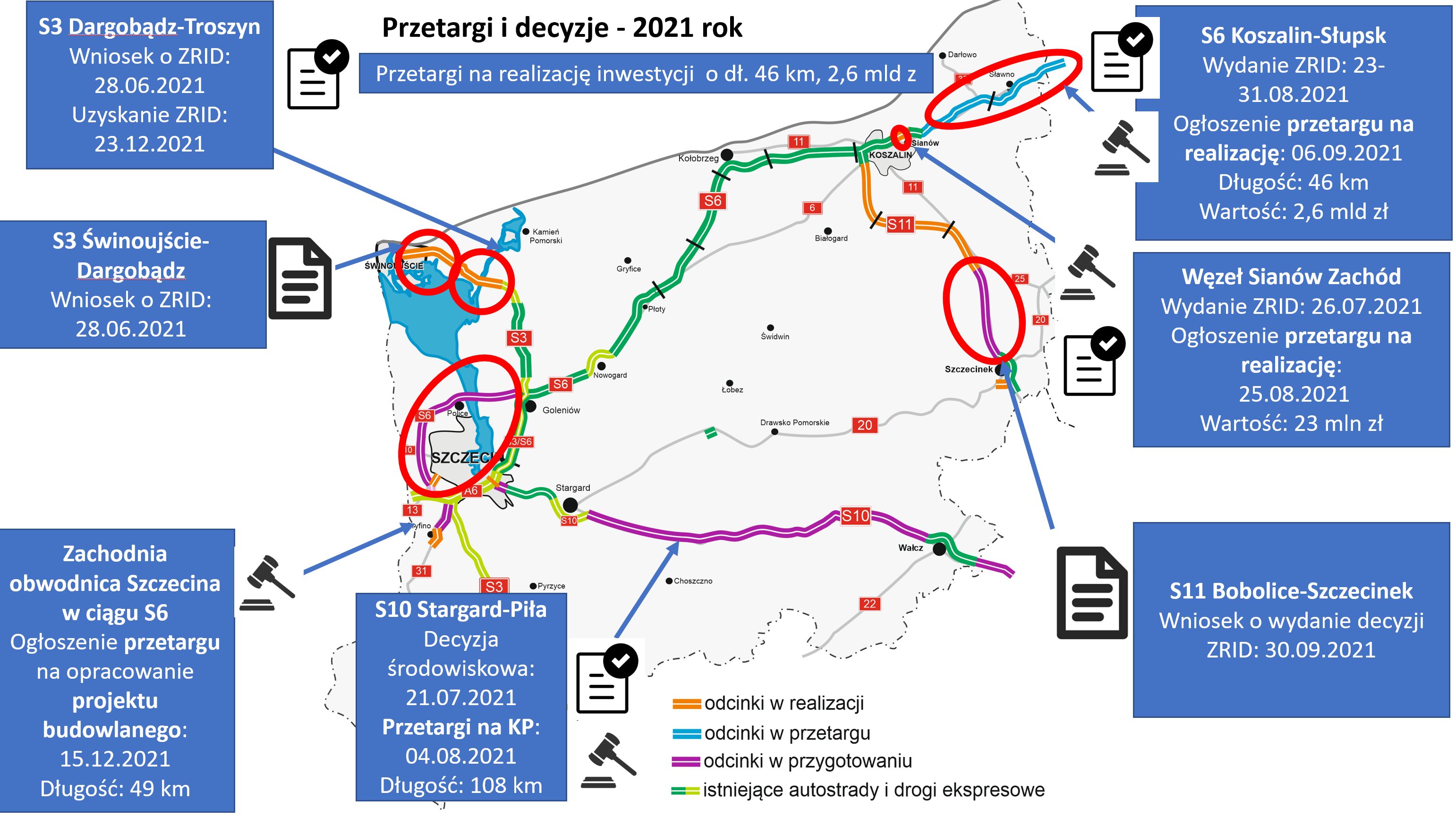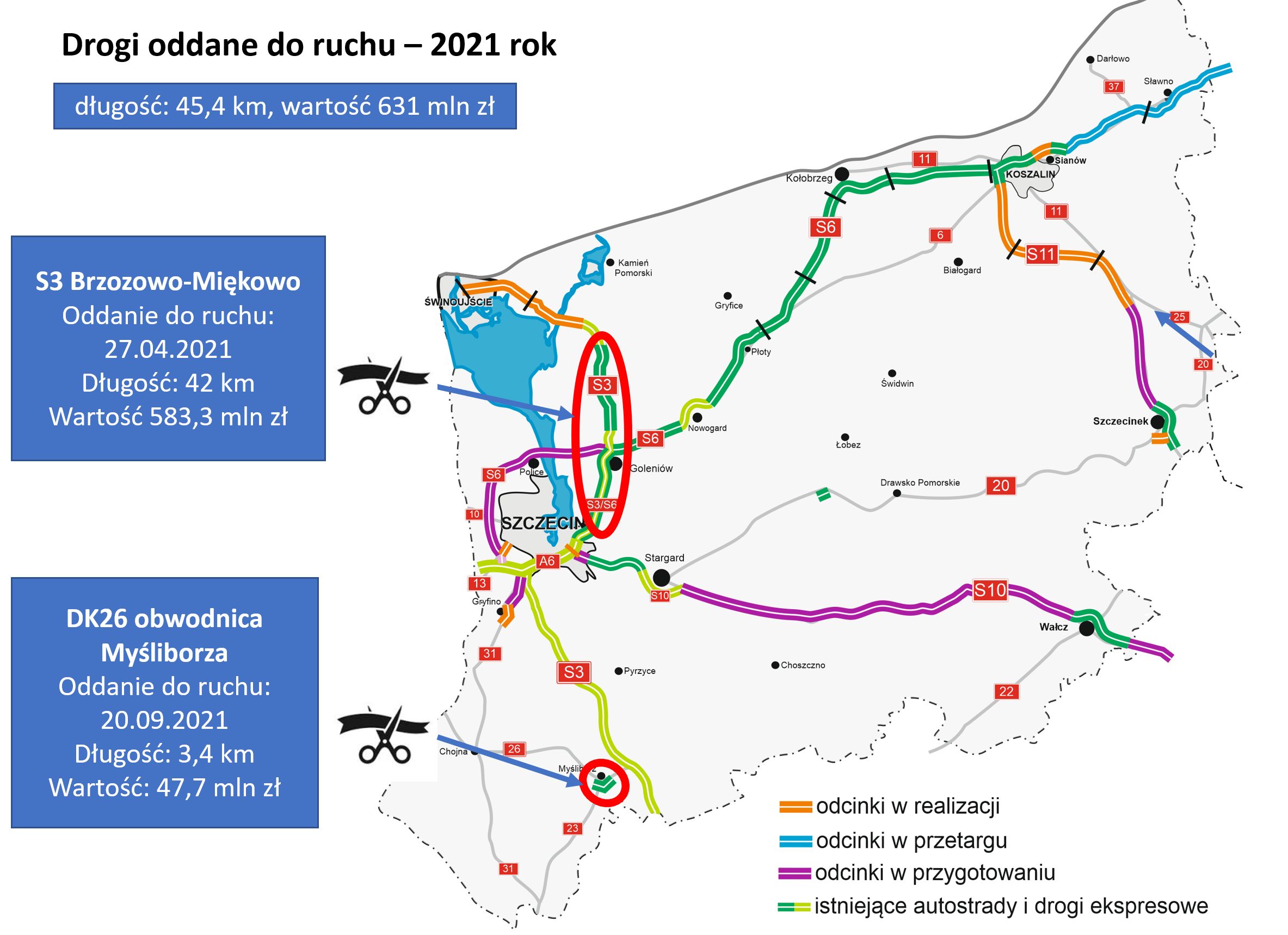 W mijającym 2021 roku udostępniliśmy kierowcom nowe drogi, o łącznej długości 45 km - S3 od Brzozowa do Rzęśnicy oraz obwodnicę Myśliborza w ciągu DK26. Prace budowlane ruszyły na 60 km S6, S11 i DK13. Podpisaliśmy umowy na budowę obwodnic Gryfina na DK31 i Szczecinka na DK20 - to inwestycje z rządowego Programu budowy 100 obwodnic. Ruszyły postępowania przetargowe dla 46 km S6 od Koszalina do Słupska. Szereg ważnych decyzji zapadł w kwestii inwestycji będących w przygotowaniu - kolejnych odcinków S6, S10 i S11. Łączna wartość obecnie realizowanych inwestycji to 5,5 mld zł, a ich długość to 107 km.