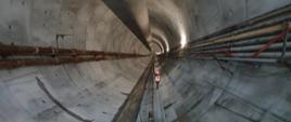 Na zdjęciu widać wnętrze tunelu i pracującą Wyspiarkę, maszynę drążącą TBM.