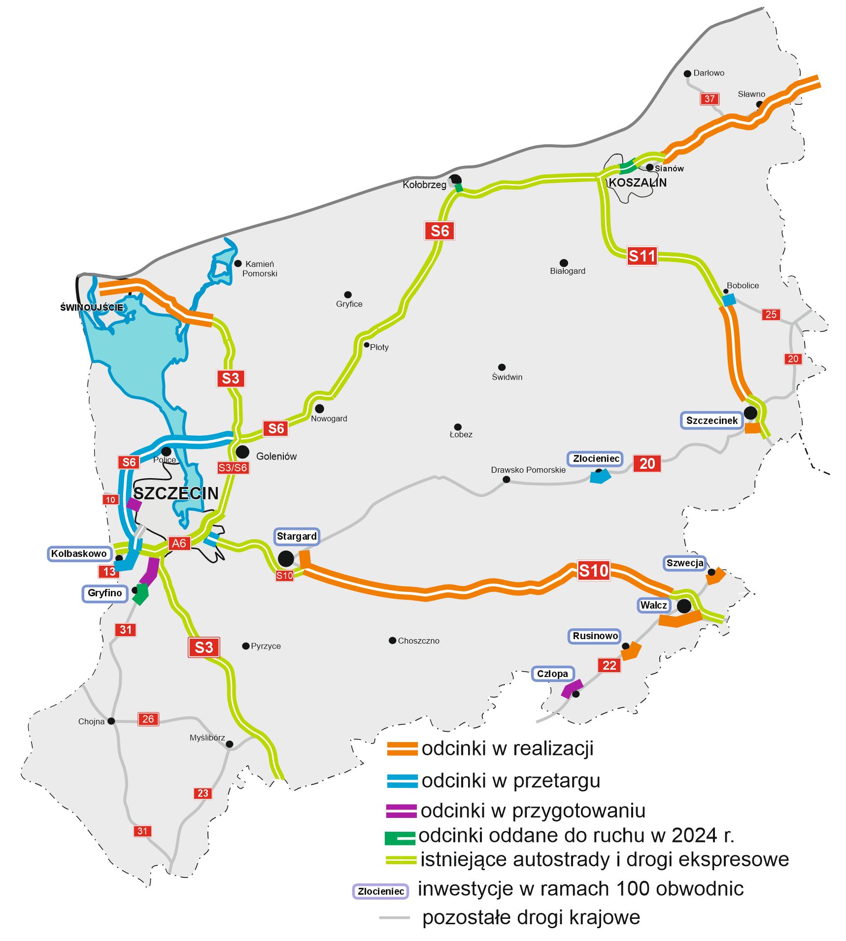 Dla obwodnicy Kołbaskowa w ciągu DK13 pod koniec września ruszył przetarg na budowę. Inwestycja będzie realizowana wspólnie z II etapem obwodnicy Przecławia i Warzymic (nowy węzeł łączący A6 z DK13). Natomiast w dniu 20 grudnia wystartował przetarg na zaprojektowanie i budowę obwodnicy Złocieńca w ciągu DK20.