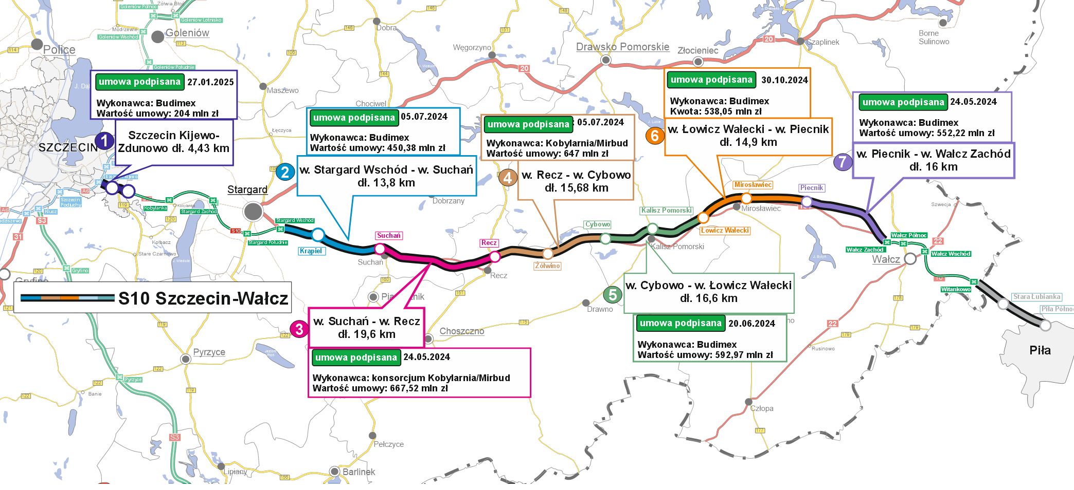 W 2024 i na początku 2025 roku podpisaliśmy umowy na realizację siedmiu odcinków S10 między Szczecinem i Wałczem (w formule Projektuj i buduj). W ubiegłym roku, zgodnie z terminami kontraktowymi (10 miesięcy od podpisania umowy), wykonawcy składali wnioski o wydanie decyzji ZRID dla poszczególnych odcinków. Jako pierwsze, w grudniu zostały uzyskane decyzje ZRID dla odcinków Stargard - Suchan i Suchań - Recz. Trwają procedury dla pozostałych czterech odcinków i kolejnych pozwoleń na budowę możemy spodziewać się w najbliższych miesiącach. Jako ostatni decyzję ZRID powinien otrzymać w połowie tego roku odcinek Szczecin Kijewo - Szczecin Zdunowo, dla którego wniosek złożyliśmy pod koniec listopada 2025 roku. Zakończenie realizacji S10 od Szczecina do Wałcza planowane jest do końca 2028 roku.