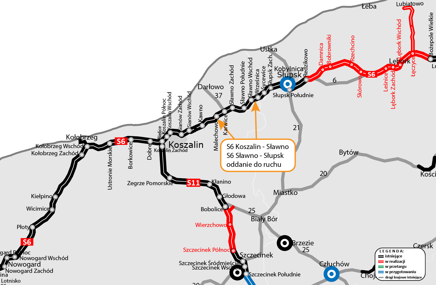 Odcinki S6 Koszalin - Słupsk dołączyły do oddanych w ciągu kilku ubiegłych lat fragmentów S6 od połączenia z S3 w rejonie Goleniowa do Sianowa.  Od 3 lat funkcjonuje również odcinek od Bożepola Wielkiego do Gdyni w województwie pomorskim. Do zakończenia pozostało jeszcze ostatnie 62 km od Słupska do funkcjonującego już odcinka Trasy Kaszubskiej w kierunku Gdyni. W przyszłym roku ta trasa będzie gotowa, wówczas będzie można drogą ekspresową dojechać ze stolicy Pomorza Zachodniego do stolicy Pomorza.