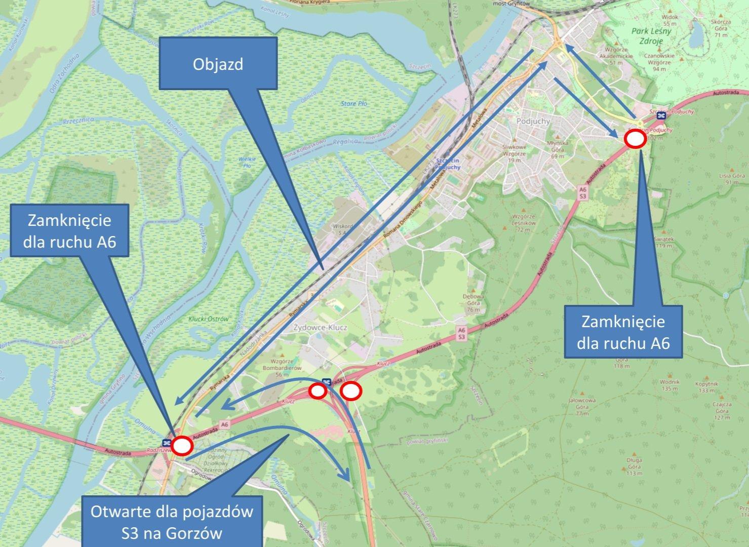 - Ruch na A6 od strony węzła Radziszewo – zjazd na węźle Radziszewo na DK31 i dalej ul. Rymarską, Metalową i Granitową, w m. Szczecin do węzła Szczecin Podjuchy - wjazd na A6. Kierowcy jadący na drogę ekspresową S3 w kierunku Gorzowa Wielkopolskiego będą przepuszczani przez policję do w. Klucz.