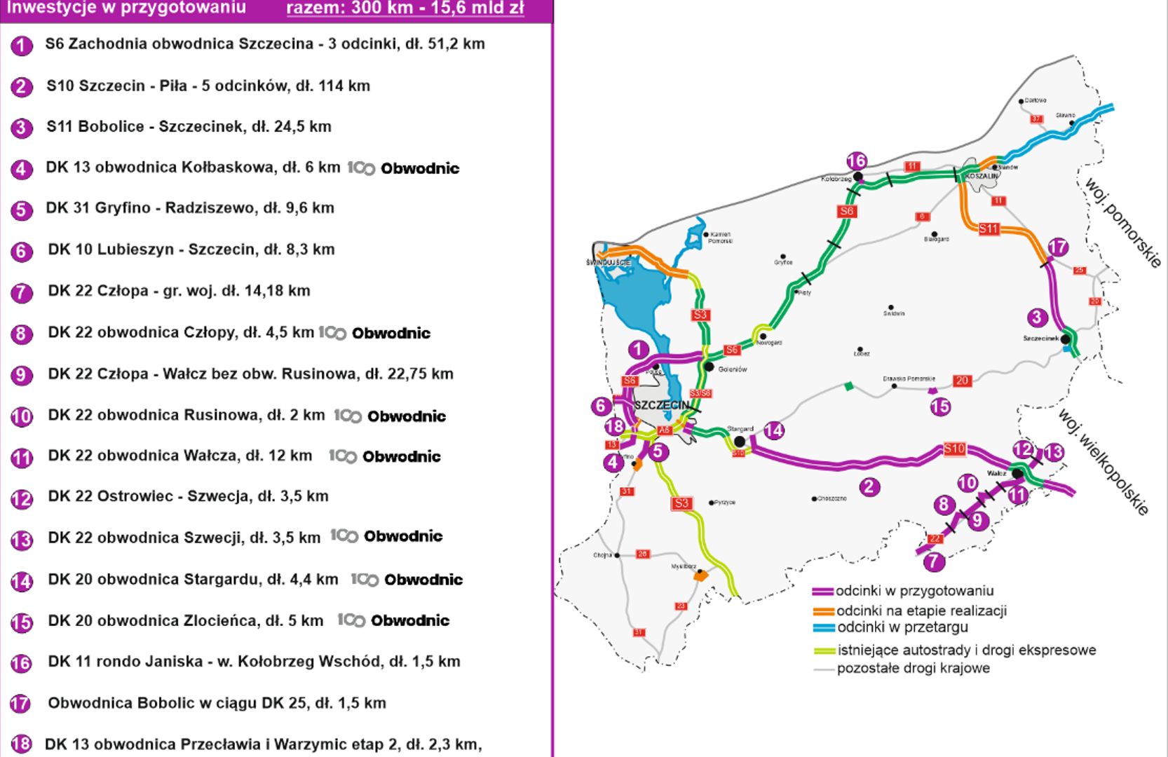 Dobrze przygotowane inwestycje to podstawa dla późniejszej budowy i eksploatacji dróg. Na terenie województwa zachodniopomorskiego w przygotowaniu jest około 300 km dróg. To cała pozostała do realizacji sieci autostrad i dróg ekspresowych oraz obwodnic na drogach krajowych w województwie. Szacunkowa łączna wartość tych inwestycji to około 16 miliardów złotych. Realizowane prace przygotowawcze pozwalają na płynne wchodzenie kolejnych zadań w fazę realizacji. Tak było na przykład z odcinkiem S6 Koszalin - Słupsk o długości 46 km, dla którego we wrześniu tego roku ogłosiliśmy przetarg na budowę.