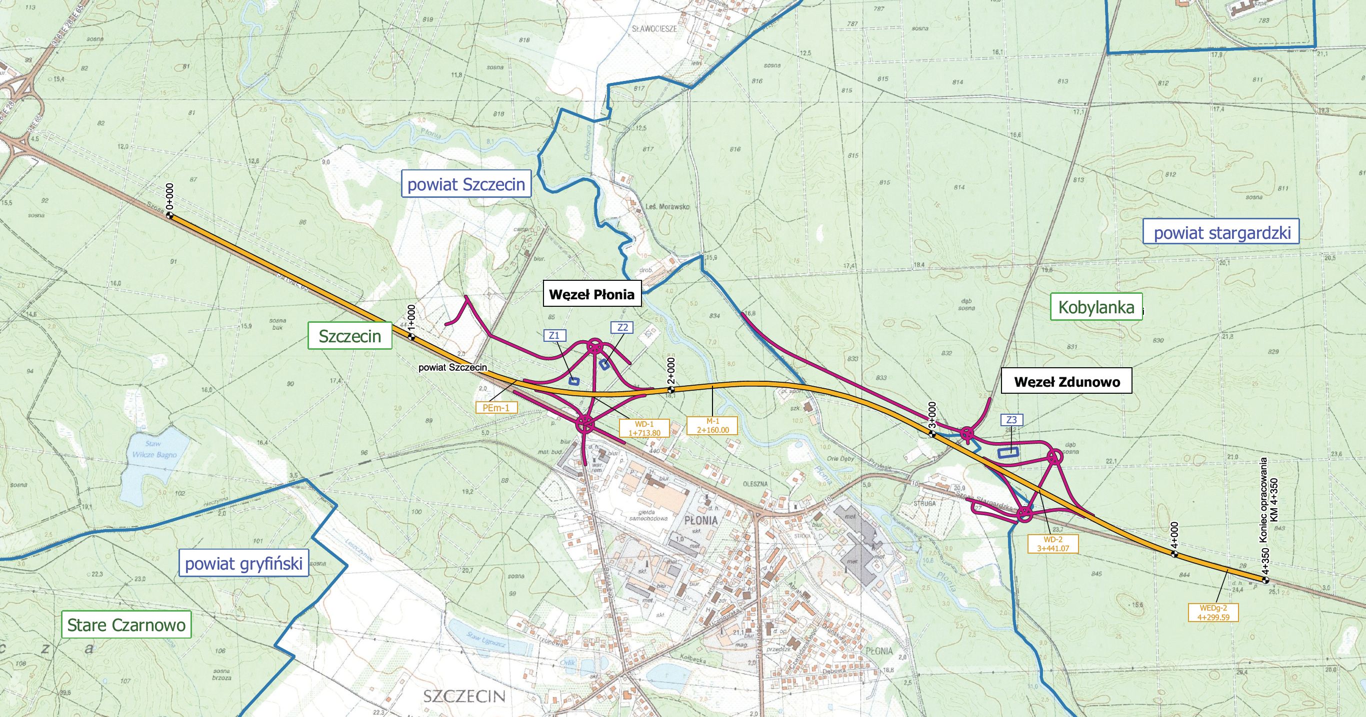 Na nowej trasie zaplanowano realizację dwóch węzłów drogowych Szczecin Zdunowo i Szczecin Płonia. Powstanie również most na rzece Płonia, dwa wiadukty i trzy przejścia dla zwierząt, w tym dwa górne przejścia dla dużych zwierząt.