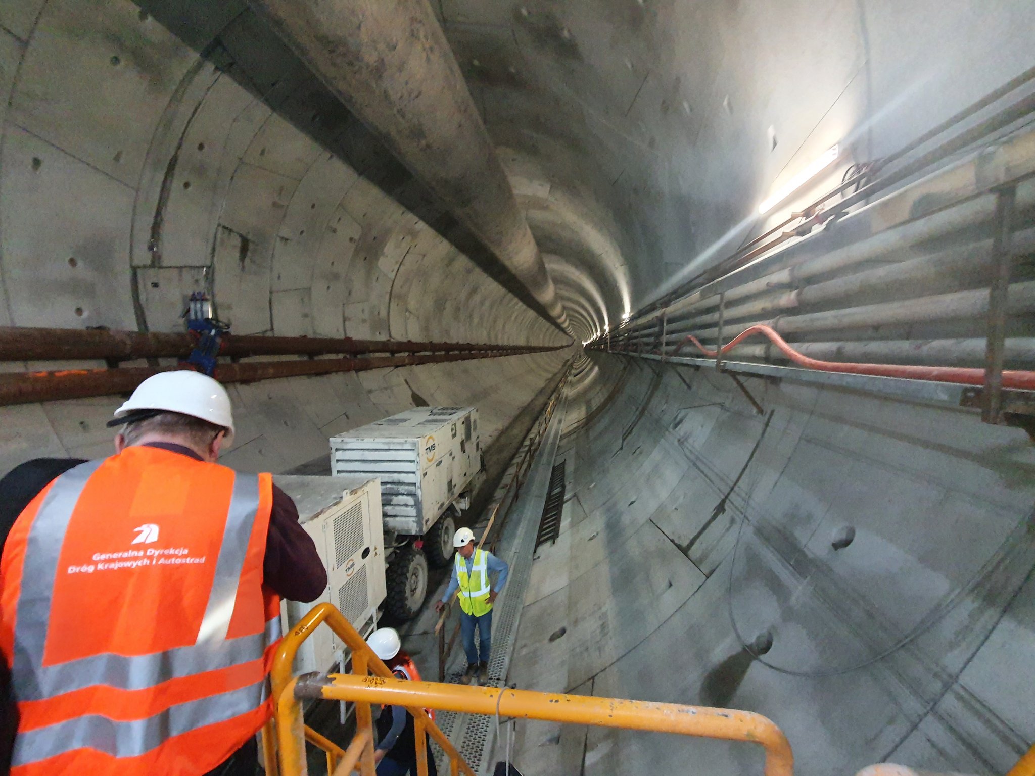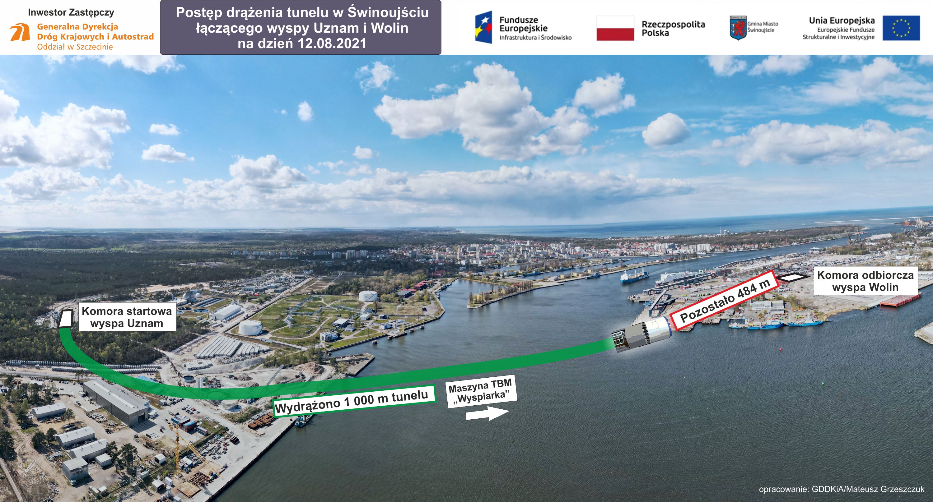 Maszyna drążąca tunel przeszła już pod cieśniną Świna. Osiągnięcie drugiego brzegu oznacza, że wydrążono już 1000 metrów tunelu, a prace prowadzone są już pod wyspą Wolin. Do osiągnięcia komory odbiorczej brakuje 484 metrów. Jesienią drążenie tunelu powinno się zakończyć. Wówczas rozpocznie się demontaż maszyny TBM i wykonywanie dalszych prac w tunelu.