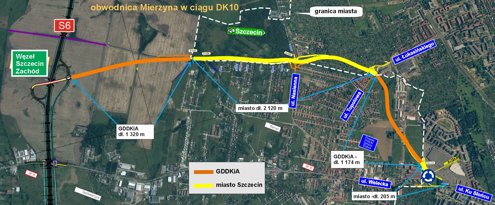 Początkiem drogi od strony Szczecina będzie skrzyżowanie na końcu ulicy Ku Słońcu w rejonie istniejącego centrum handlowego. Ten początkowy fragment, o długości ponad 200 m, to teren Miasta Szczecin. Dalej trasa będzie biegła w kierunku północnym, do połączenia ulic Topolowej i Łukasińskiego. Za ten odcinek o długości ok. 1,2 km będzie odpowiedzialna GDDKiA. Dalej trasa ponownie wejdzie na teren Szczecina i będzie biegła w kierunku zachodnim, przechodząc częściowo przez teren ogródków działkowych. Po ok. 2,1 km droga opuści teren miasta. Dalej nowa DK10 po pokonaniu ok. 1,3 km dotrze do węzła Szczecin Zachód (Dołuje). Za ten ostatni fragment również odpowiada GDDKiA.