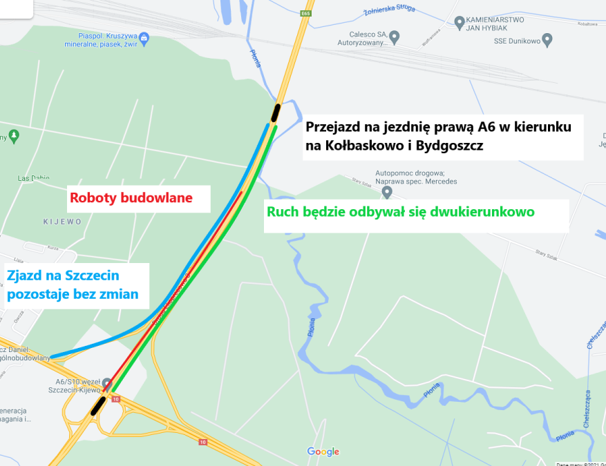 Od strony Kołbaskowa ruch w kierunku na Gdańsk pozostaje bez zmian i będzie się odbywał po prawej jezdni, z ograniczeniem do jednego pasa ruchu. Ruch w kierunku przejścia granicznego w Kołbaskowie (relacja Gdańsk - Kołbaskowo) będzie przeniesiony na prawą jezdnię A6. Od mostu na rzece Płonia do wiaduktu nad autostradą ruch na prawej jezdni będzie dwukierunkowy.
