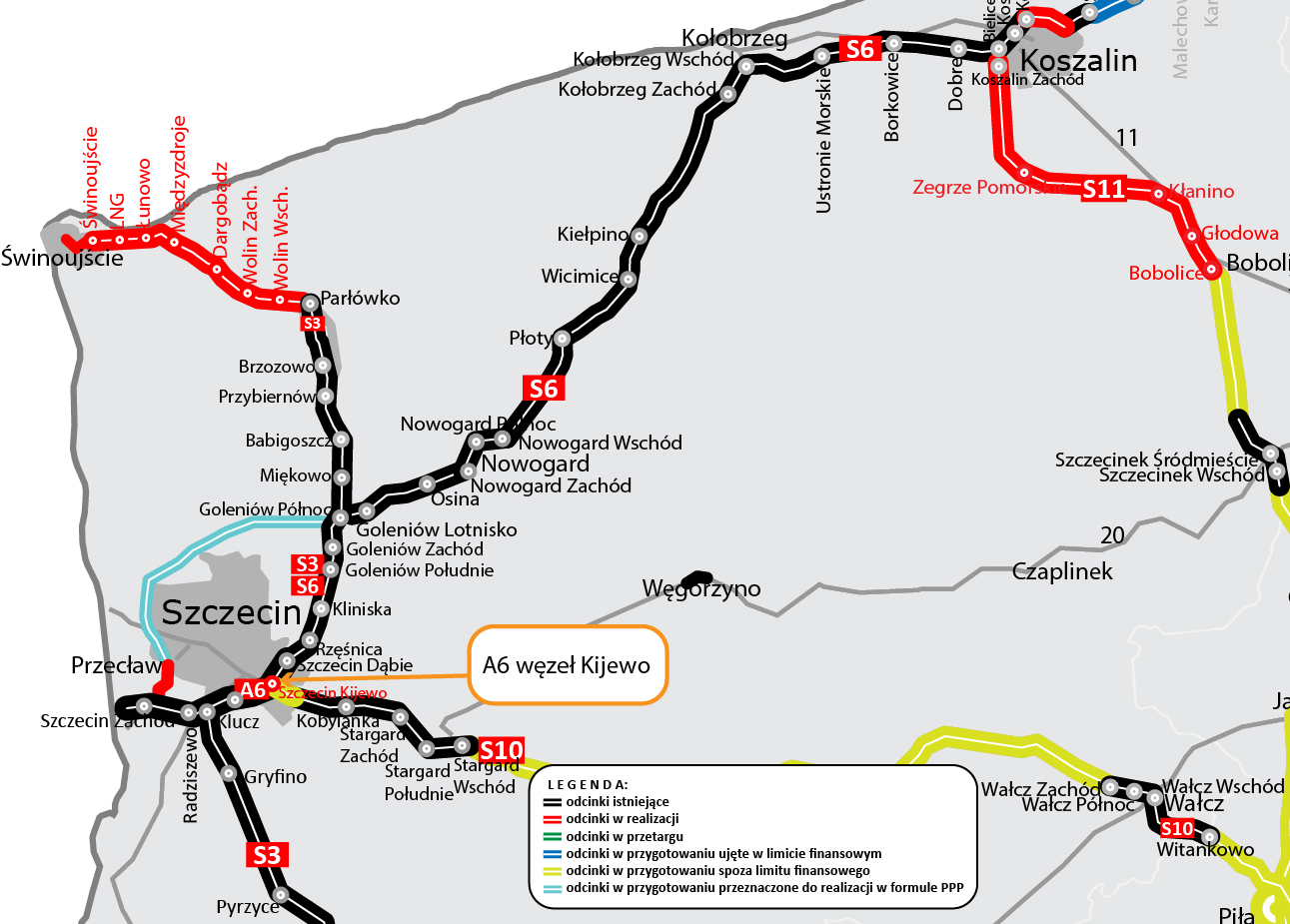 Obecnie wykonawca prowadzi prace związane z układaniem warstw bitumicznych. Wykonywane są także podpory pod nowy wiadukt nad autostradą A6. Z jezdni autostrady usunięte zostaną ostatnie stare betonowe płyty i w ich miejsce powstanie nowa nawierzchnia bitumiczna. Wzdłuż autostrady zostaną wykonane jezdnie zbiorczo-rozprowadzające. Równocześnie prowadzone są także roboty elektryczne, prace związane z odwodnieniem korpusu drogowego i telekomunikacyjne. W połowie przyszłego roku planowane jest zakończenie prac na węźle Kijewo.