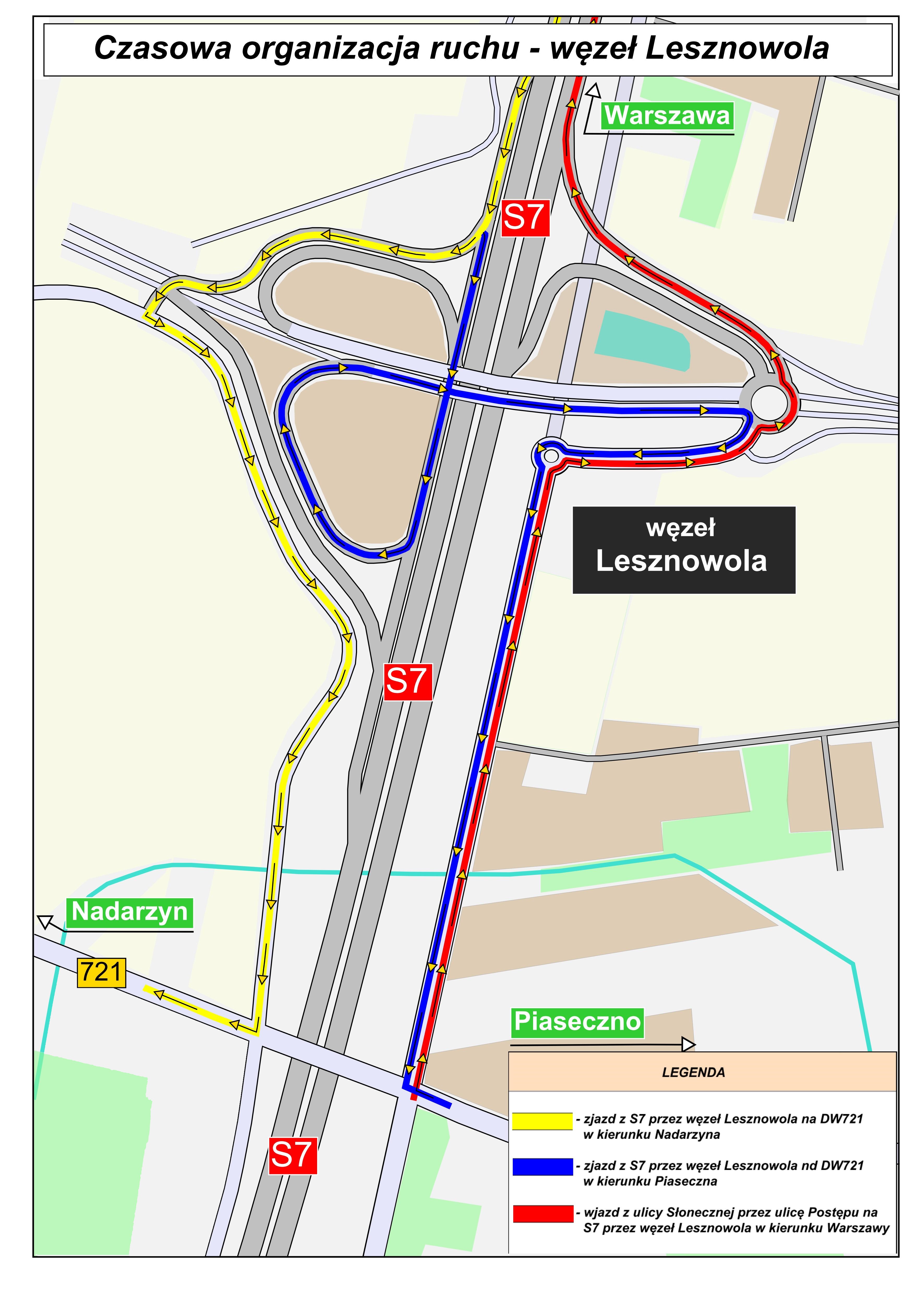 Odcinek Warszawa Lotnisko - Lesznowola powstał w docelowym układzie i po połączeniu z sąsiednim zapewni nowy wyjazd ze stolicy w kierunku Krakowa. Niestety, za sprawą braku nowego przebiegu drogi wojewódzkiej 721, zjazd z S7 na jej obecny przebieg w kierunku Nadarzyna i Piaseczna ma tymczasowe rozwiązanie. Z węzła Lesznowola w kierunku Nadarzyna kierowcy wjeżdżają na drogę serwisową po zachodniej stronie S7, do ulicy Słonecznej. Z kolei ruch w kierunku Piaseczna prowadzi przez węzeł Lesznowola, do wybudowanego ronda w ciągu ul. Postępu oraz dalej ulicą Postępu do ulicy Słonecznej. Jednocześnie wjazd na drogę ekspresową z lokalnej sieci dróg odbywa się wyłącznie ulicą Postępu.