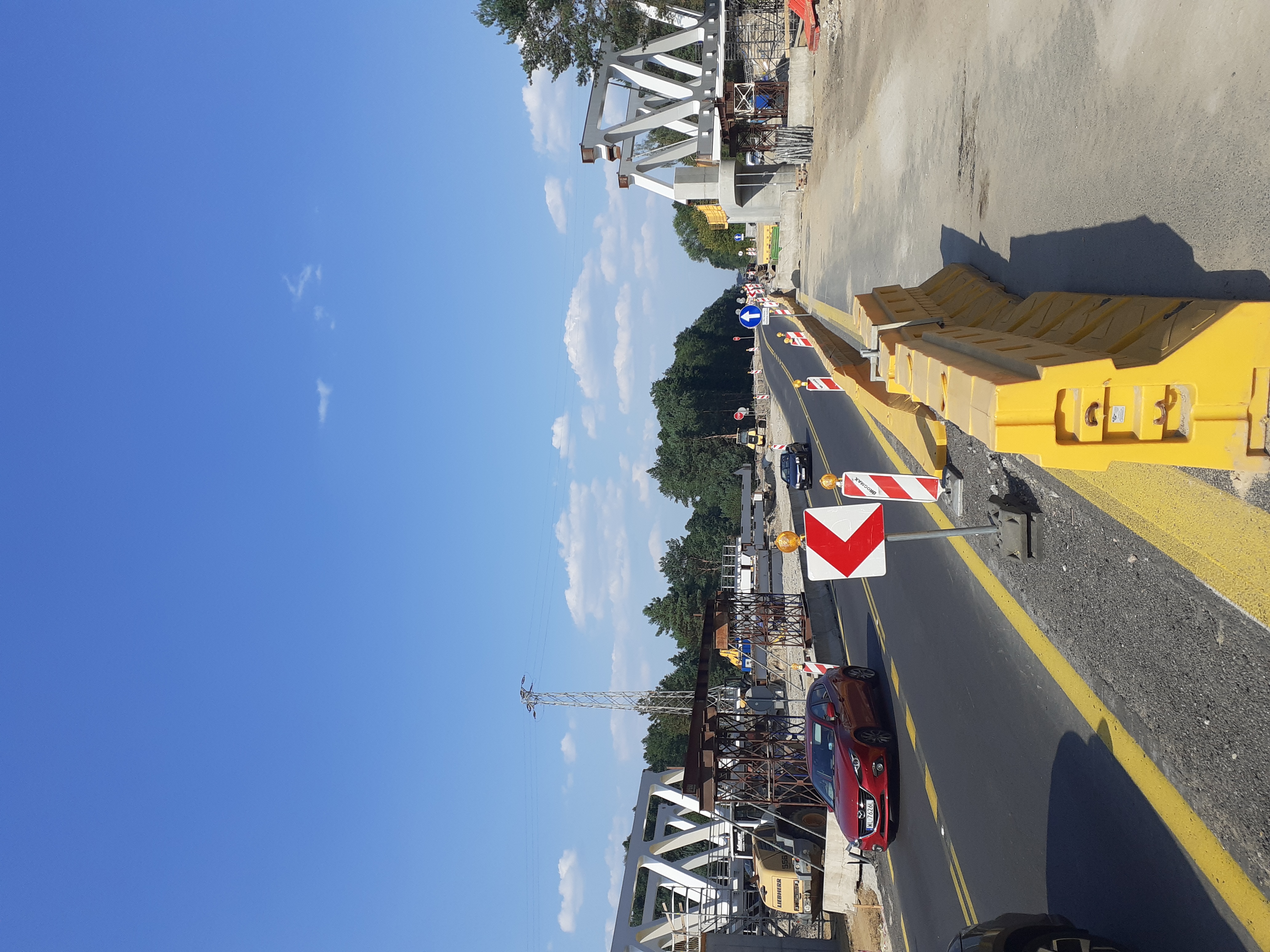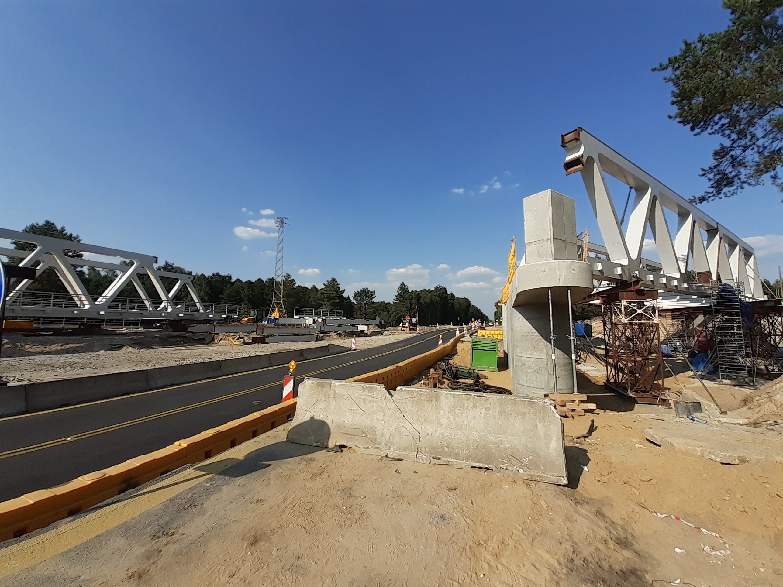 Na czas budowy nowego obiektu kolejowego wykonana została tymczasowa droga. Kierowcy mają do dyspozycji po jednym pasie w obu kierunkach. To umożliwiło wykonawcy budowę nowego obiektu kolejowego. Zdemontowane zostało przęsło wiaduktu kolejowego, sieci trakcyjne i tory. Wyburzone są przyczółki i budowane nowe. Montowane są także podpory tymczasowe, na których powstanie konstrukcja obiektu.