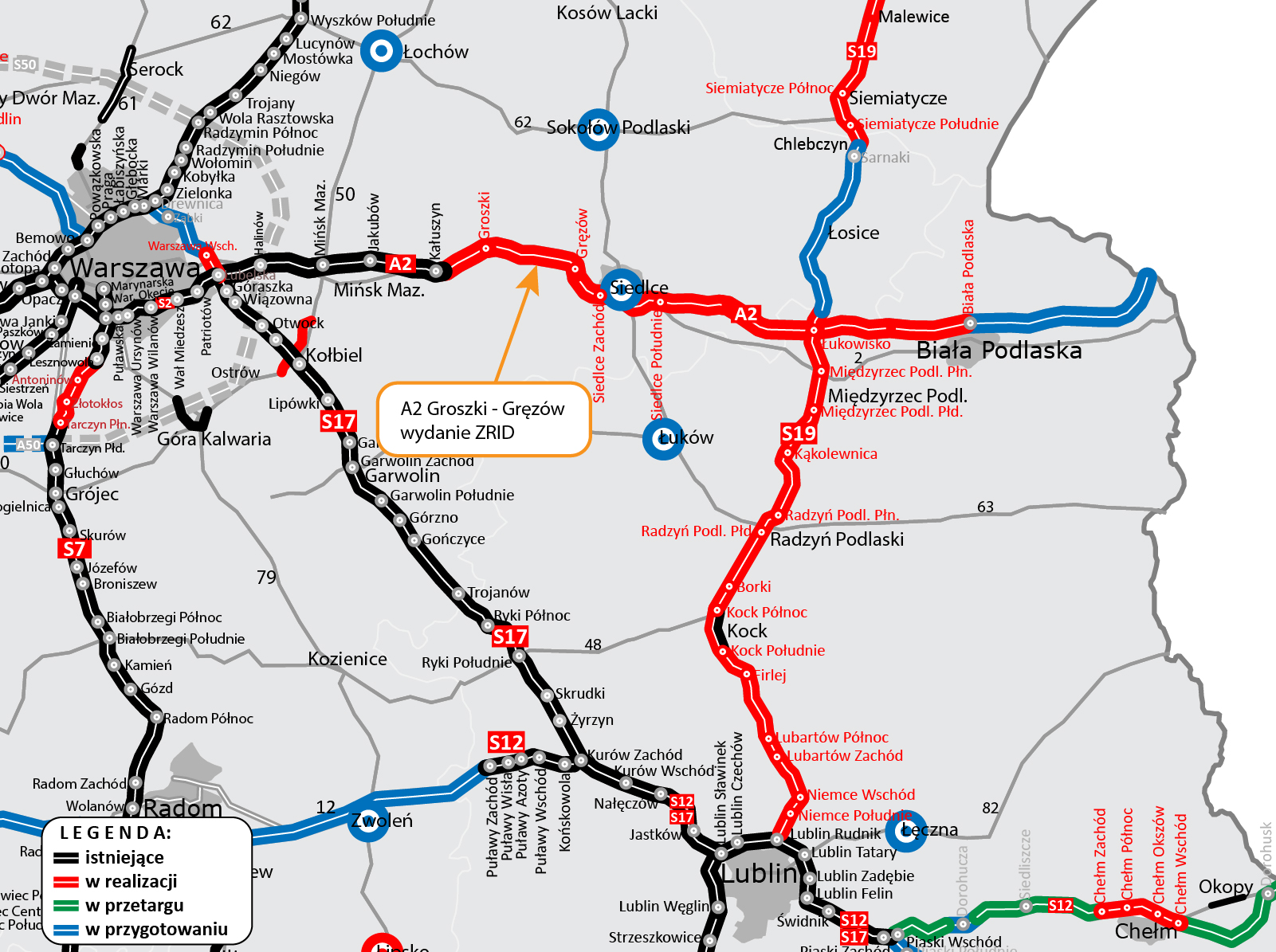 W kwietniu 2021 r. podpisaliśmy umowy na cztery odcinki A2 od Siedlec do Białej Podlaskiej. Dla trzech z nich, pomiędzy węzłem Siedlce Zachód a miejscowością Swory, trwają postępowania administracyjne w Urzędzie Wojewódzkim w Warszawie. Szacujemy, że na początku 2023 r. otrzymamy decyzje ZRID, co umożliwi wykonawcom rozpoczęcie robót w terenie. Dla czwartego odcinka, Swory - Biała Podlaska, 16 września br. Wojewoda Lubelski wydał decyzję ZRID, dzięki czemu mogliśmy przekazać wykonawcy plac budowy.